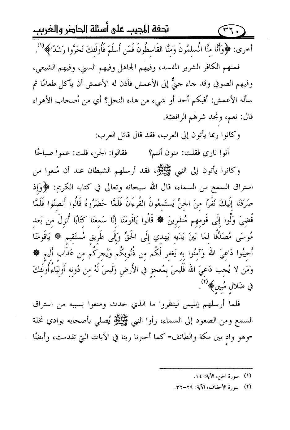 وكانوا يأتون إلى النبي صلى الله عليه وعلى آله وسلم، فقد أرسلهم الشيطان عند أن منعوا من استراق السمع من السماء، قال الله سبحانه وتعالى في كتابه الكريم: {وإذ صرفنا إليك نفرًا من الجنّ يستمعون القرءان فلمّا حضروه قالوا أنصتوا فلمّا قضي ولّوا إلى قومهم منذرين قالوا ياقومنا إنّا سمعنا كتابًا أنزل من بعد موسى مصدّقًا لما بين يديه يهدي إلى الحقّ وإلى طريق مستقيم ياقومنا أجيبوا داعي الله وآمنوا به يغفر لكم من ذنوبكم ويجركم من عذاب أليم ومن لا يجب داعي الله فليس بمعجز في الأرض وليس له من دونه أولياء أولئك في ضلال مبين (¬2)}.