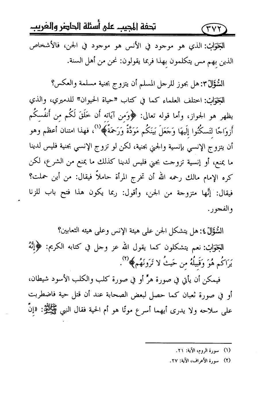 الجواب: اختلف العلماء كما في كتاب "حياة الحيوان" للدميري، والذي يظهر هو الجواز، وأما قوله تعالى: {ومن آياته أن خلق لكم من أنفسكم أزواجًا لتسكنوا إليها وجعل بينكم مودّةً ورحمةً (¬1)}، فهذا امتنان أعظم وهو أن يتزوج الإنسي بإنسية والجني بجنية، لكن لو تزوج الإنسي بجنية فليس لدينا ما يمنع، أو إنسية تزوجت بجني فليس لدينا كذلك ما يمنع من الشرع، لكن كره الإمام مالك رحمه الله أن تخرج المرأة حاملاً فيقال: من أين حملت؟ فيقال: إنّها متزوجة من الجن، وأقول: ربما يكون هذا فتح باب للزنا والفجور.