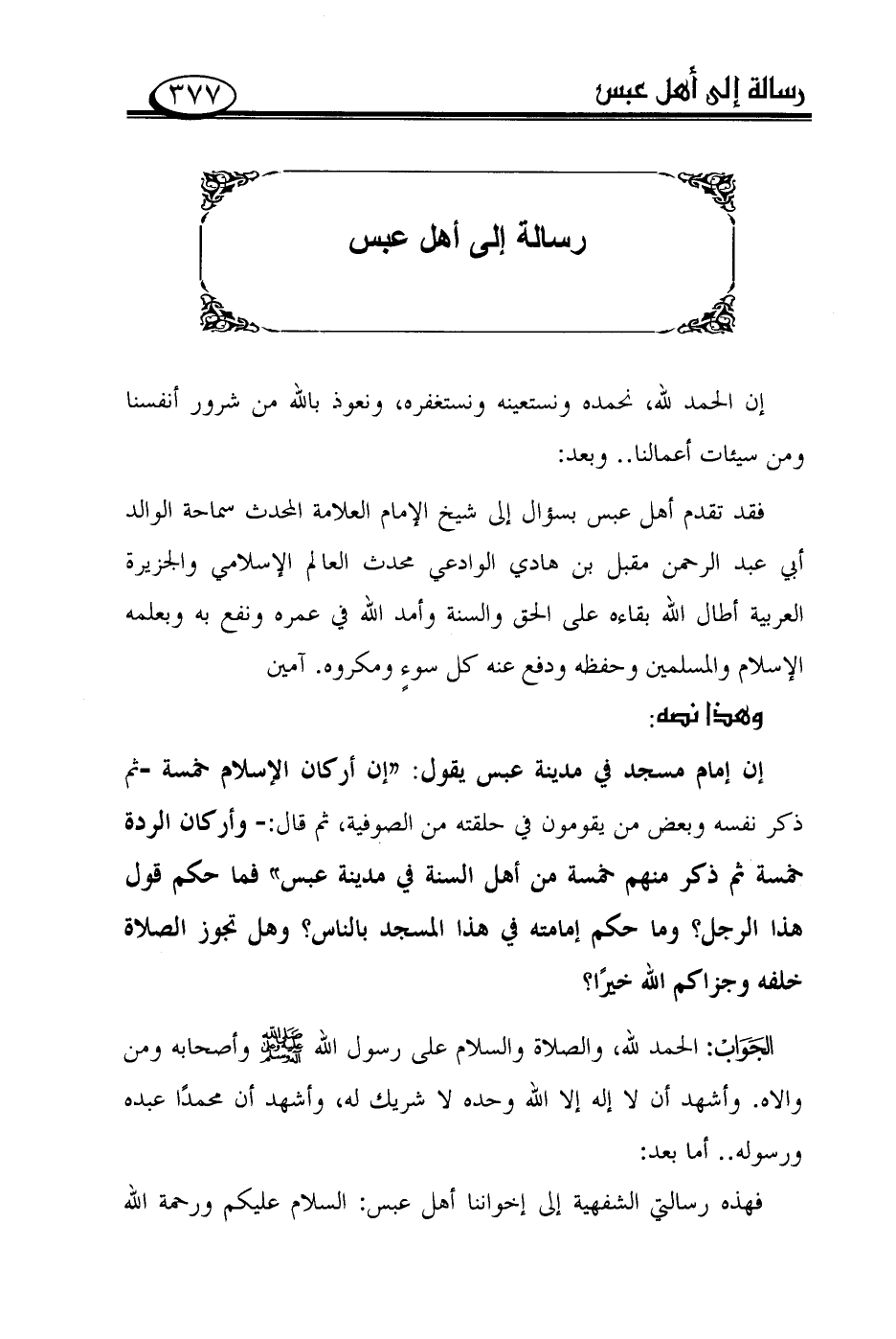 فقد تقدم أهل عبس بسؤال إلى شيخ الإمام العلامة المحدث سماحة الوالد أبي عبد الرحمن مقبل بن هادي الوادعي محدث العالم الإسلامي والجزيرة العربية أطال الله بقاءه على الحق والسنة وأمد الله في عمره ونفع به وبعلمه الإسلام والمسلمين وحفظه ودفع عنه كل سوء ومكروه. آمين