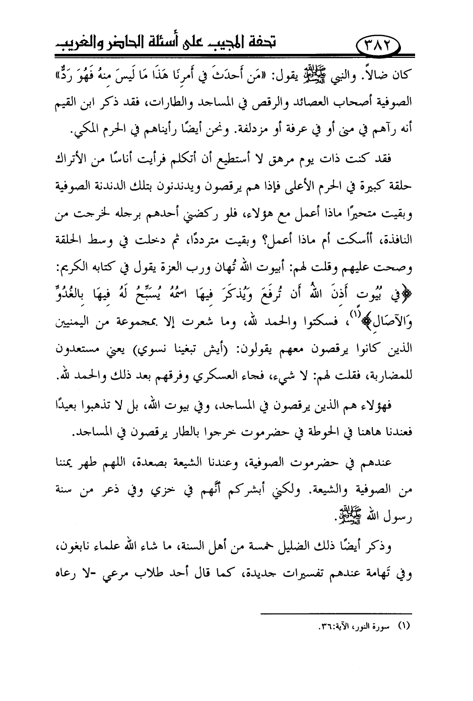 فقد كنت ذات يوم مرهق لا أستطيع أن أتكلم فرأيت أناسًا من الأتراك حلقة كبيرة في الحرم الأعلى فإذا هم يرقصون ويدندنون بتلك الدندنة الصوفية وبقيت متحيرًا ماذا أعمل مع هؤلاء، فلو ركضني أحدهم برجله لخرجت من النافذة، أأسكت أم ماذا أعمل؟ وبقيت مترددًا، ثم دخلت في وسط الحلقة وصحت عليهم وقلت لهم: أبيوت الله تهان ورب العزة يقول في كتابه الكريم: {في بيوت أذن الله أن ترفع ويذكر فيها اسمه يسبّح له فيها بالغدوّ والآصال (¬1)}، فسكتوا والحمد لله، وما شعرت إلا بمجموعة من اليمنيين الذين كانوا يرقصون معهم يقولون: (أيش تبغينا نسوي) يعني مستعدون للمضاربة، فقلت لهم: لا شيء، فجاء العسكري وفرقهم بعد ذلك والحمد لله.
