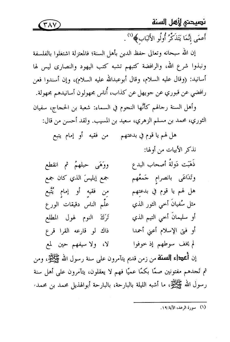 ذهبت دولة أصحاب البدعوتداعى بانصرام جمعهمهل لهم يا قوم في بدعتهممثل سفيان أخي الثور الذيأو سليمان أخي التيم الذيأو فتى الإسلام أعني أحمدالم يخف سوطهم إذ خوفوا ... ووهى حبلهم ثم انقطعجمع إبليس الذي كان جمعمن فقيه أو إمام يتّبععلّم الناس دقيقات الورعترك النوم لهول المطلعذاك لو قارعه القرا قرعلا، ولا سيفهم حين لمع