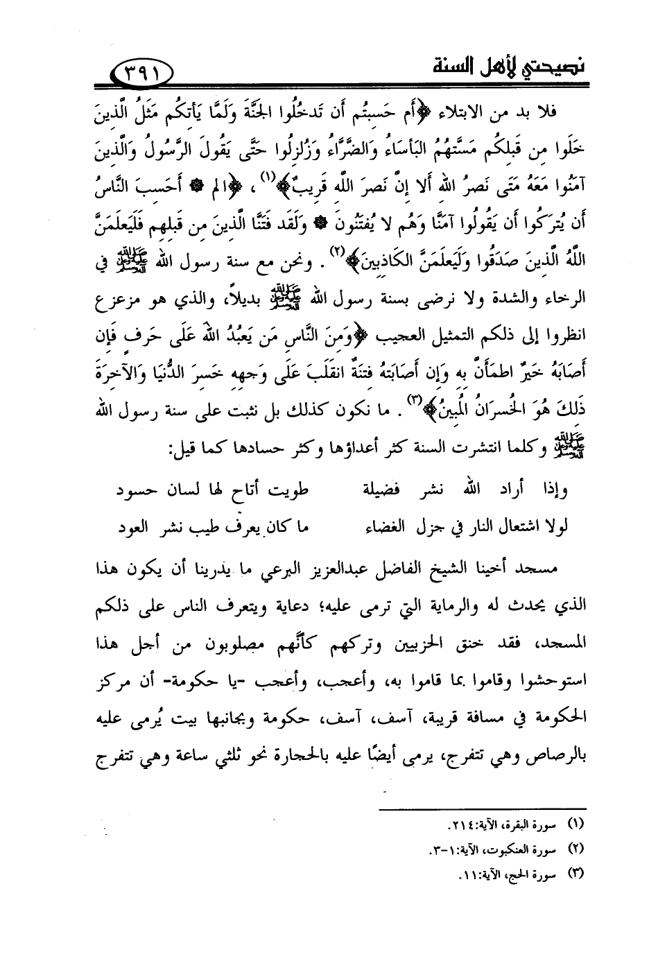 فلا بد من الابتلاء {أم حسبتم أن تدخلوا الجنّة ولمّا يأتكم مثل الّذين خلوا من قبلكم مسّتهم البأساء والضّرّاء وزلزلوا حتّى يقول الرّسول والّذين آمنوا معه متى نصر الله ألا إنّ نصر الله قريب (¬1)}، {الم أحسب النّاس أن يتركوا أن يقولوا آمنّا وهم لا يفتنون ولقد فتنّا الّذين من قبلهم فليعلمنّ الله الّذين صدقوا وليعلمنّ الكاذبين (¬2)}. ونحن مع سنة رسول الله صلى الله عليه وعلى آله وسلم في الرخاء والشدة ولا نرضى بسنة رسول الله صلى الله عليه وعلى آله وسلم بديلاً، والذي هو مزعزع انظروا إلى ذلكم التمثيل العجيب {ومن النّاس من يعبد الله على حرف فإن أصابه خير اطمأنّ به وإن أصابته فتنة انقلب على وجهه خسر الدّنيا والآخرة ذلك هو الخسران المبين (¬3)}. ما نكون كذلك بل نثبت على سنة رسول الله صلى الله عليه وعلى آله وسلم وكلما انتشرت السنة كثر أعداؤها وكثر حسادها كما قيل: