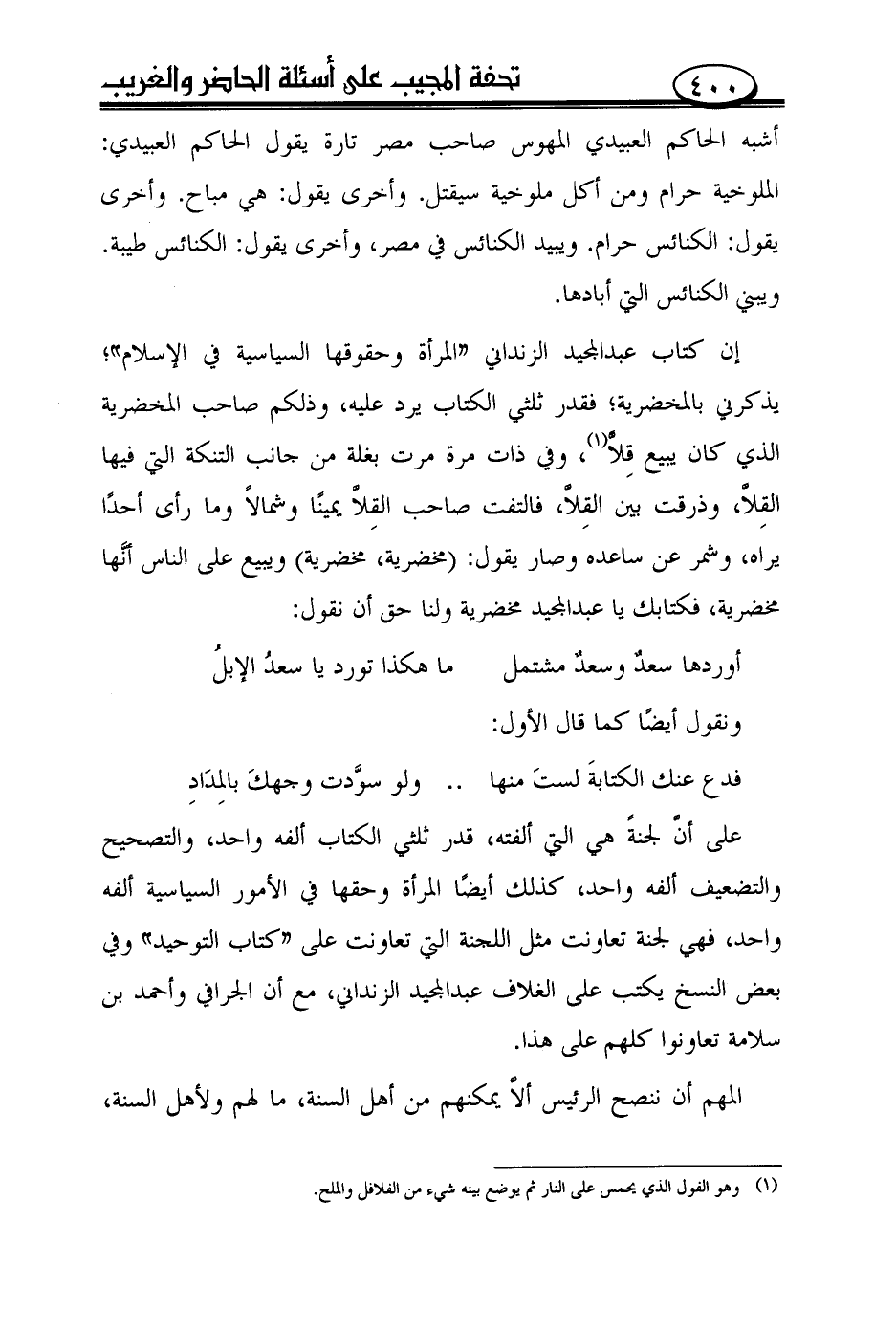 إن كتاب عبد المجيد الزنداني "المرأة وحقوقها السياسية في الإسلام"؛ يذكرني بالمخضرية؛ فقدر ثلثي الكتاب يرد عليه، وذلكم صاحب المخضرية الذي كان يبيع قلاًّ (¬1)، وفي ذات مرة مرت بغلة من جانب التنكة التي فيها القلاّ، وذرقت بين القلاّ، فالتفت صاحب القلاّ يمينًا وشمالاً وما رأى أحدًا يراه، وشمر عن ساعده وصار يقول: (مخضرية، مخضرية) ويبيع على الناس أنّها مخضرية، فكتابك يا عبد المجيد مخضرية ولنا حق أن نقول: