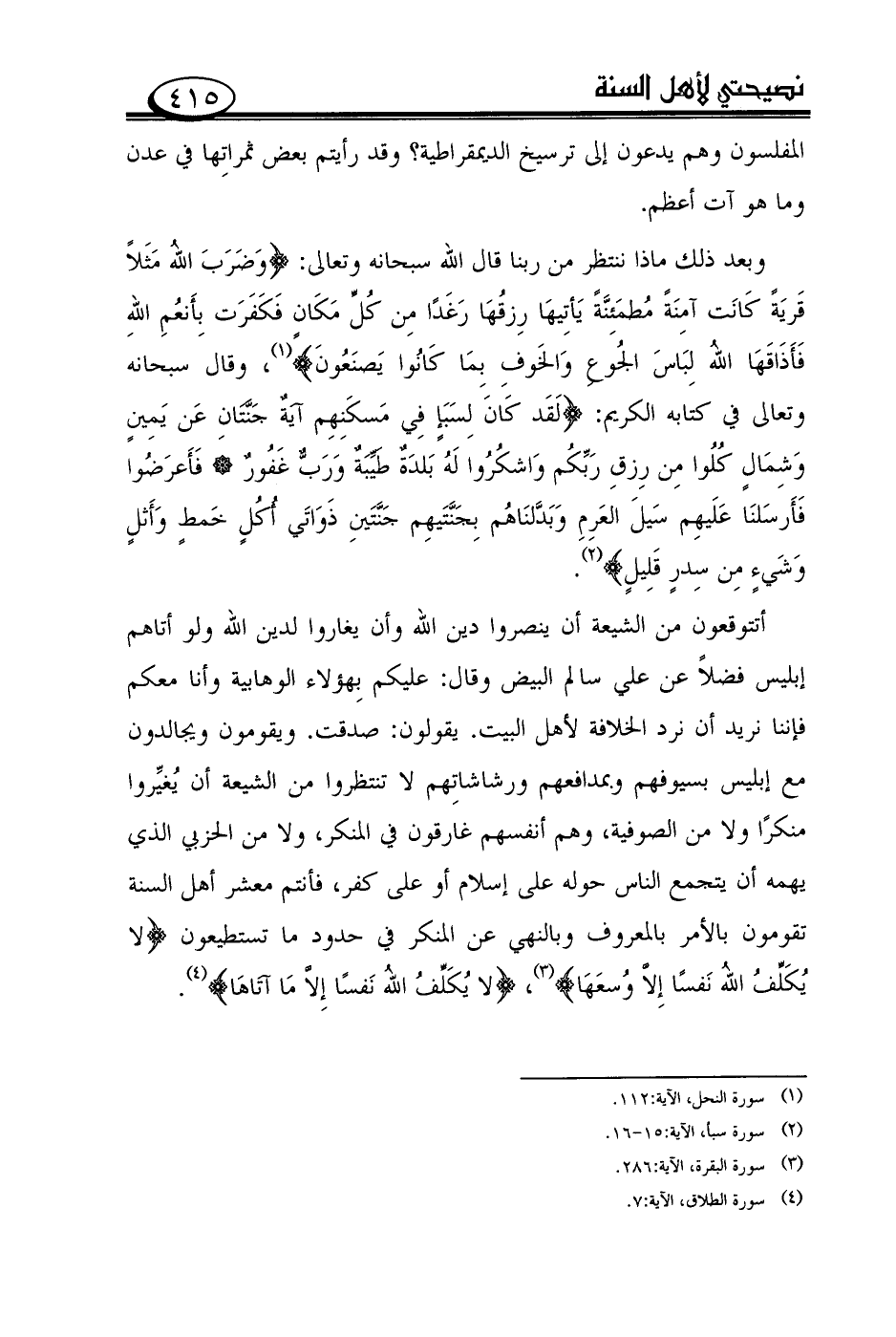 أتتوقعون من الشيعة أن ينصروا دين الله وأن يغاروا لدين الله ولو أتاهم إبليس فضلاً عن علي سالم البيض وقال: عليكم بهؤلاء الوهابية وأنا معكم فإننا نريد أن نرد الخلافة لأهل البيت. يقولون: صدقت. ويقومون ويجالدون مع إبليس بسيوفهم وبمدافعهم ورشاشاتهم لا تنتظروا من الشيعة أن يغيّروا منكرًا ولا من الصوفية، وهم أنفسهم غارقون في المنكر، ولا من الحزبي الذي يهمه أن يتجمع الناس حوله على إسلام أو على كفر، فأنتم معشر أهل السنة تقومون بالأمر بالمعروف وبالنهي عن المنكر في حدود ما تستطيعون لا يكلّف الله نفسًا إلاّ وسعها (¬3)، لا يكلّف الله نفسًا إلاّ ما آتاها (¬4).