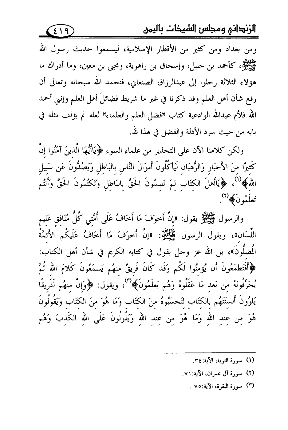 ومن بغداد ومن كثير من الأقطار الإسلامية، ليسمعوا حديث رسول الله صلى الله عليه وعلى آله وسلم، كأحمد بن حنبل، وإسحاق بن راهوية، ويحيى بن معين، وما أدراك ما هؤلاء الثلاثة رحلوا إلى عبد الرزاق الصنعاني، فنحمد الله سبحانه وتعالى أن رفع شأن أهل العلم وقد ذكرنا في غير ما شريط فضائل أهل العلم وإنني أحمد الله فلأم عبد الله الوادعية كتاب "فضل العلم والعلماء" لعله لم يؤلف مثله في بابه من حيث سرد الأدلة والفضل في هذا لله.