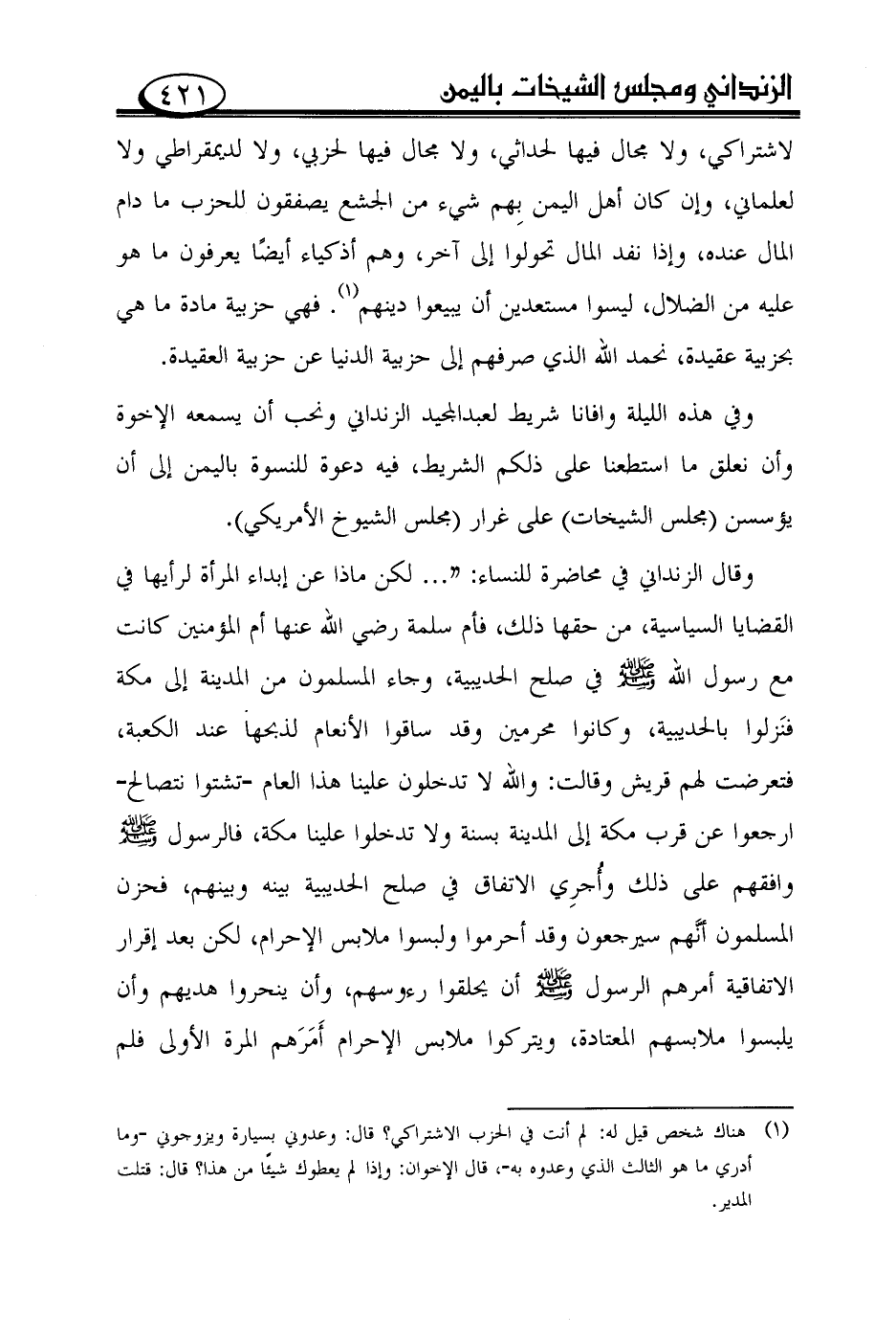 وفي هذه الليلة وافانا شريط لعبد المجيد الزنداني ونحب أن يسمعه الإخوة وأن نعلق ما استطعنا على ذلكم الشريط، فيه دعوة للنسوة باليمن إلى أن يؤسسن (مجلس الشيخات) على غرار (مجلس الشيوخ الأمريكي).