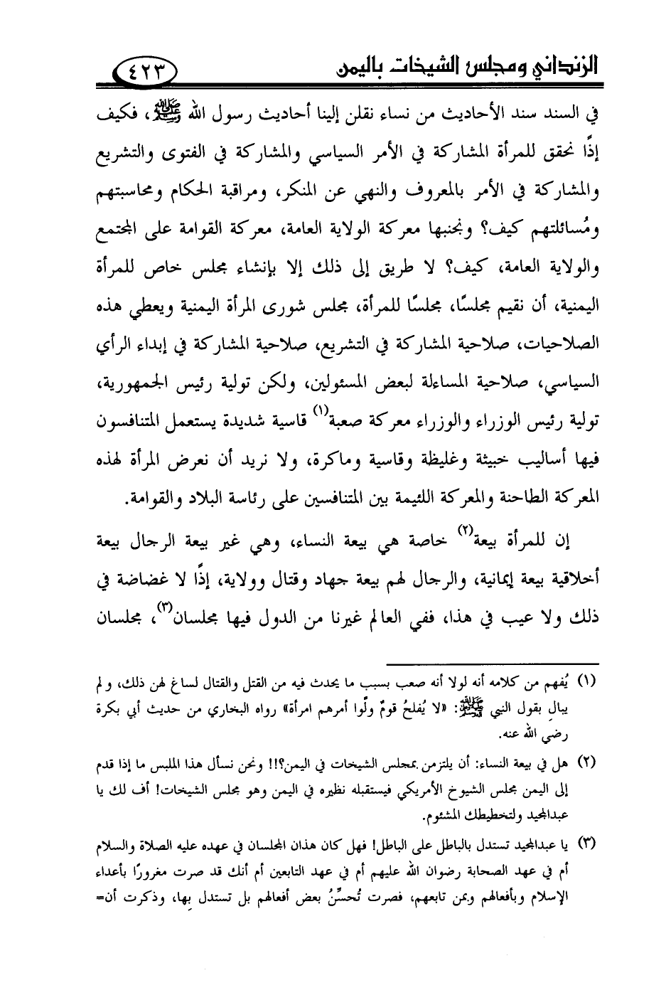 (¬2) هل في بيعة النساء: أن يلتزمن بمجلس الشيخات في اليمن؟!! ونحن نسأل هذا الملبس ما إذا قدم إلى اليمن مجلس الشيوخ الأمريكي فيستقبله نظيره في اليمن وهو مجلس الشيخات! أف لك يا عبد المجيد ولتخطيطك المشئوم.