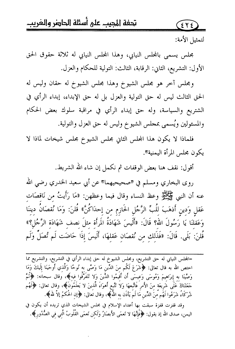فلماذا لا يكون هذا المجلس الثاني مجلس الشيوخ مجلس شيخات لماذا لا يكون مجلس المرأة اليمنية".
