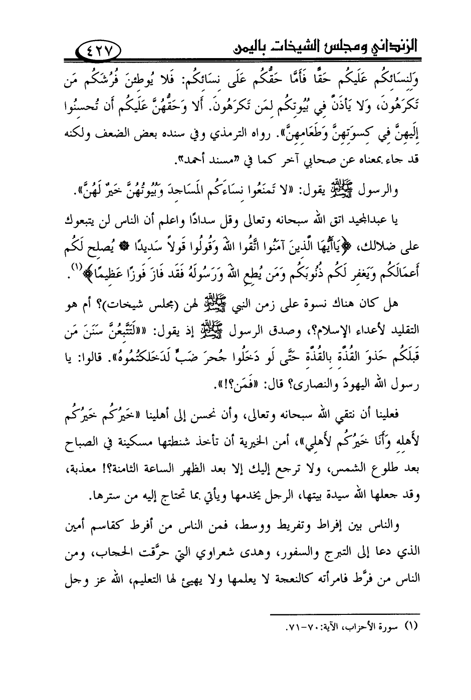 هل كان هناك نسوة على زمن النبي صلى الله عليه وعلى آله وسلم لهن (مجلس شيخات)؟ أم هو التقليد لأعداء الإسلام؟، وصدق الرسول صلى الله عليه وعلى آله وسلم إذ يقول: ((((لتتّبعنّ سنن من قبلكم حذو القذّة بالقذّة حتّى لو دخلوا جحر ضبّ لدخلكتموه)). قالوا: يا رسول الله اليهود والنصارى؟ قال: ((فمن؟!)).