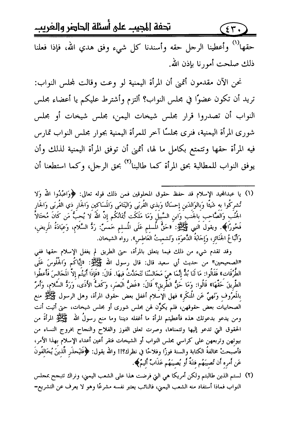 نحن الآن مقدمون أتمنى أن المرأة اليمنية لو وعت وقالت لمجلس النواب: تريد أن تكون عضوًا في مجلس النواب؟ ألتزم وأشترط عليكم يا أعضاء مجلس النواب أن تصدروا قرار مجلس شيخات اليمن، مجلس شيخات أو مجلس شورى المرأة اليمنية، فنرى مجلسًا آخر للمرأة اليمنية بجوار مجلس النواب تمارس فيه المرأة حقها وتتمتع بكامل ما لها، أتمنى أن توفق المرأة اليمنية لذلك وأن يوفق النواب للمطالبة بحق المرأة كما طالبنا (¬2) بحق الرجل، وكما استطعنا أن
