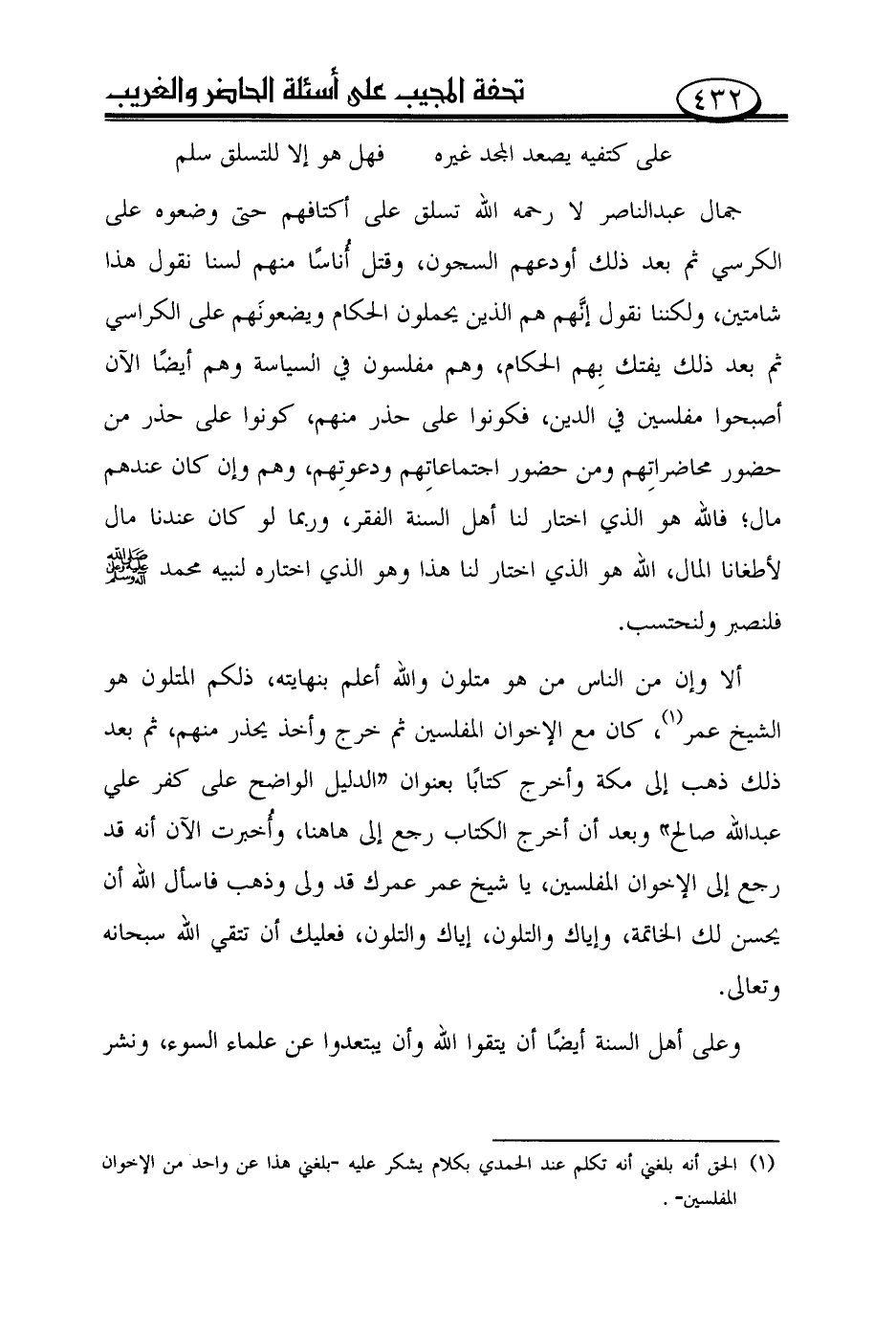 جمال عبد الناصر لا رحمه الله تسلق على أكتافهم حتى وضعوه على الكرسي ثم بعد ذلك أودعهم السجون، وقتل أناسًا منهم لسنا نقول هذا شامتين، ولكننا نقول إنّهم هم الذين يحملون الحكام ويضعونهم على الكراسي ثم بعد ذلك يفتك بهم الحكام، وهم مفلسون في السياسة وهم أيضًا الآن أصبحوا مفلسين في الدين، فكونوا على حذر منهم، كونوا على حذر من حضور محاضراتهم ومن حضور اجتماعاتهم ودعوتهم، وهم وإن كان عندهم مال؛ فالله هو الذي اختار لنا أهل السنة الفقر، وربما لو كان عندنا مال لأطغانا المال، الله هو الذي اختار لنا هذا وهو الذي اختاره لنبيه محمد صلى الله عليه وعلى آله وسلم فلنصبر ولنحتسب.