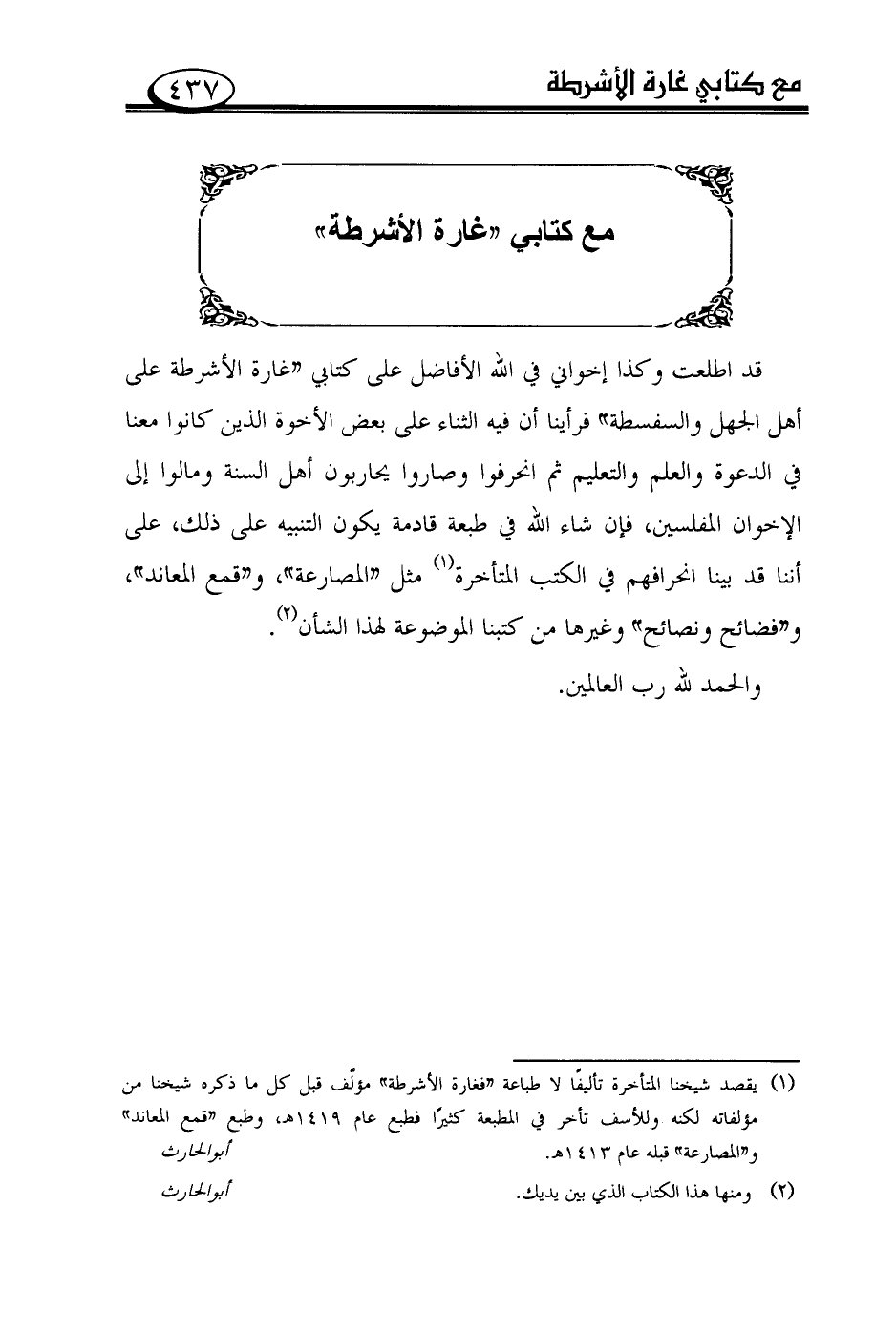 قد اطلعت وكذا إخواني في الله الأفاضل على كتابي "غارة الأشرطة على أهل الجهل والسفسطة" فرأينا أن فيه الثناء على بعض الأخوة الذين كانوا معنا في الدعوة والعلم والتعليم ثم انحرفوا وصاروا يحاربون أهل السنة ومالوا إلى الإخوان المفلسين، فإن شاء الله في طبعة قادمة يكون التنبيه على ذلك، على أننا قد بينا انحرافهم في الكتب المتأخرة (¬1)