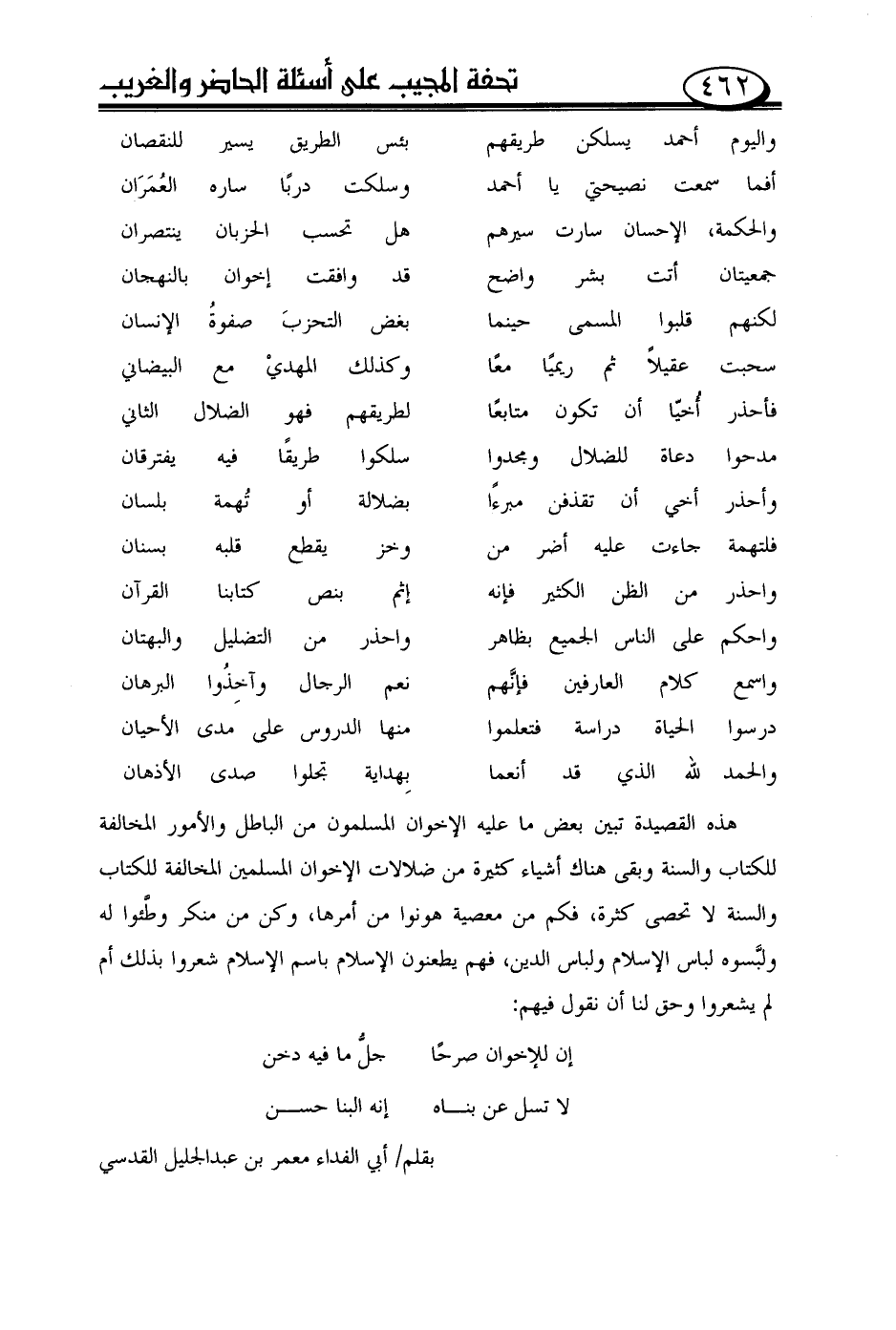هذه القصيدة تبين بعض ما عليه الإخوان المسلمون من الباطل والأمور المخالفة للكتاب والسنة وبقى هناك أشياء كثيرة من ضلالات الإخوان المسلمين المخالفة للكتاب والسنة لا تحصى كثرة، فكم من معصية هونوا من أمرها، وكن من منكر وطَّئوا له ولبَّسوه لباس الإسلام ولباس الدين، فهم يطعنون الإسلام باسم الإسلام شعروا بذلك أم لم يشعروا وحق لنا أن نقول فيهم: