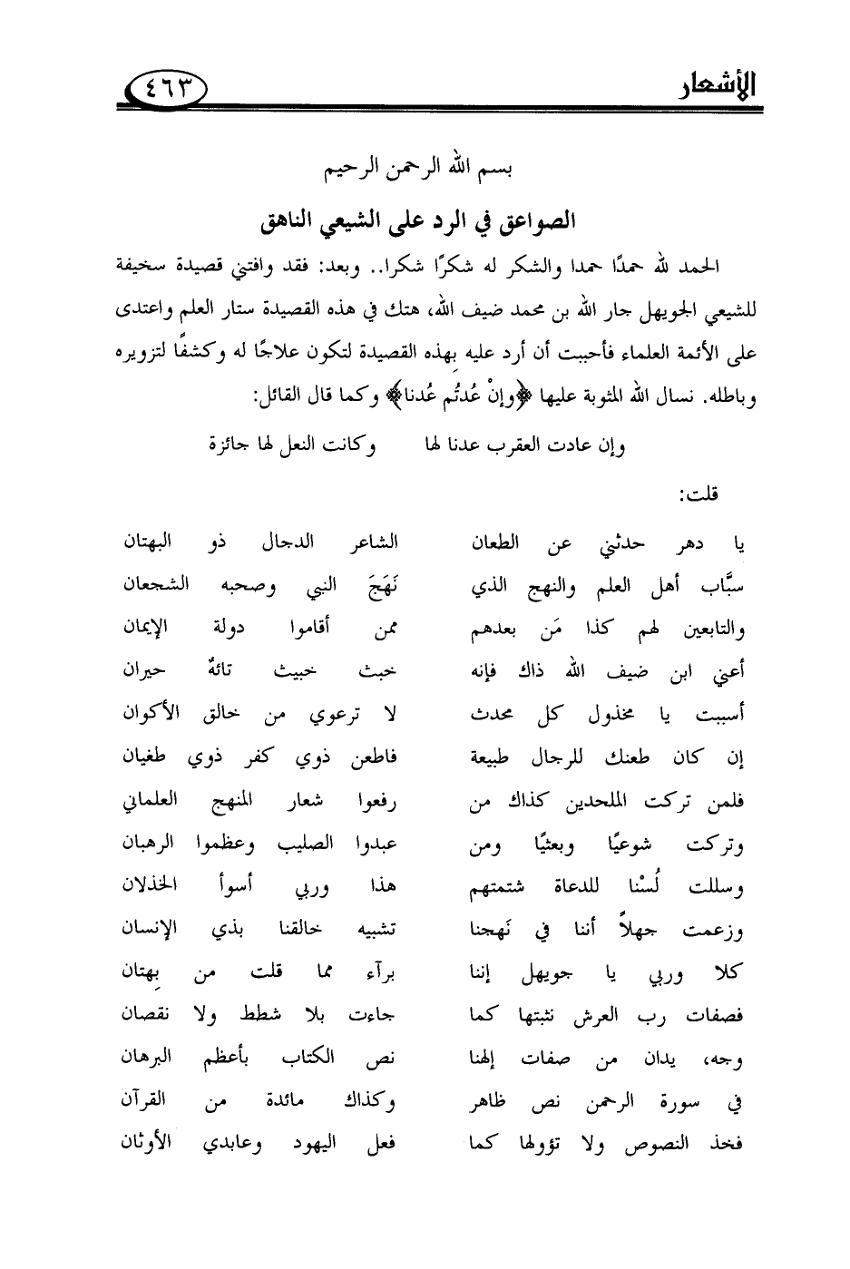 الحمد لله حمدًا حمدا والشكر له شكرًا شكرا .. وبعد: فقد وافتني قصيدة سخيفة للشيعي الجويهل جار الله بن محمد ضيف الله، هتك في هذه القصيدة ستار العلم واعتدى على الأئمة العلماء فأحببت أن أرد عليه بِهذه القصيدة لتكون علاجًا له وكشفًا لتزويره وباطله. نسال الله المثوبة عليها {وإنْ عُدتُم عُدنا} وكما قال القائل: