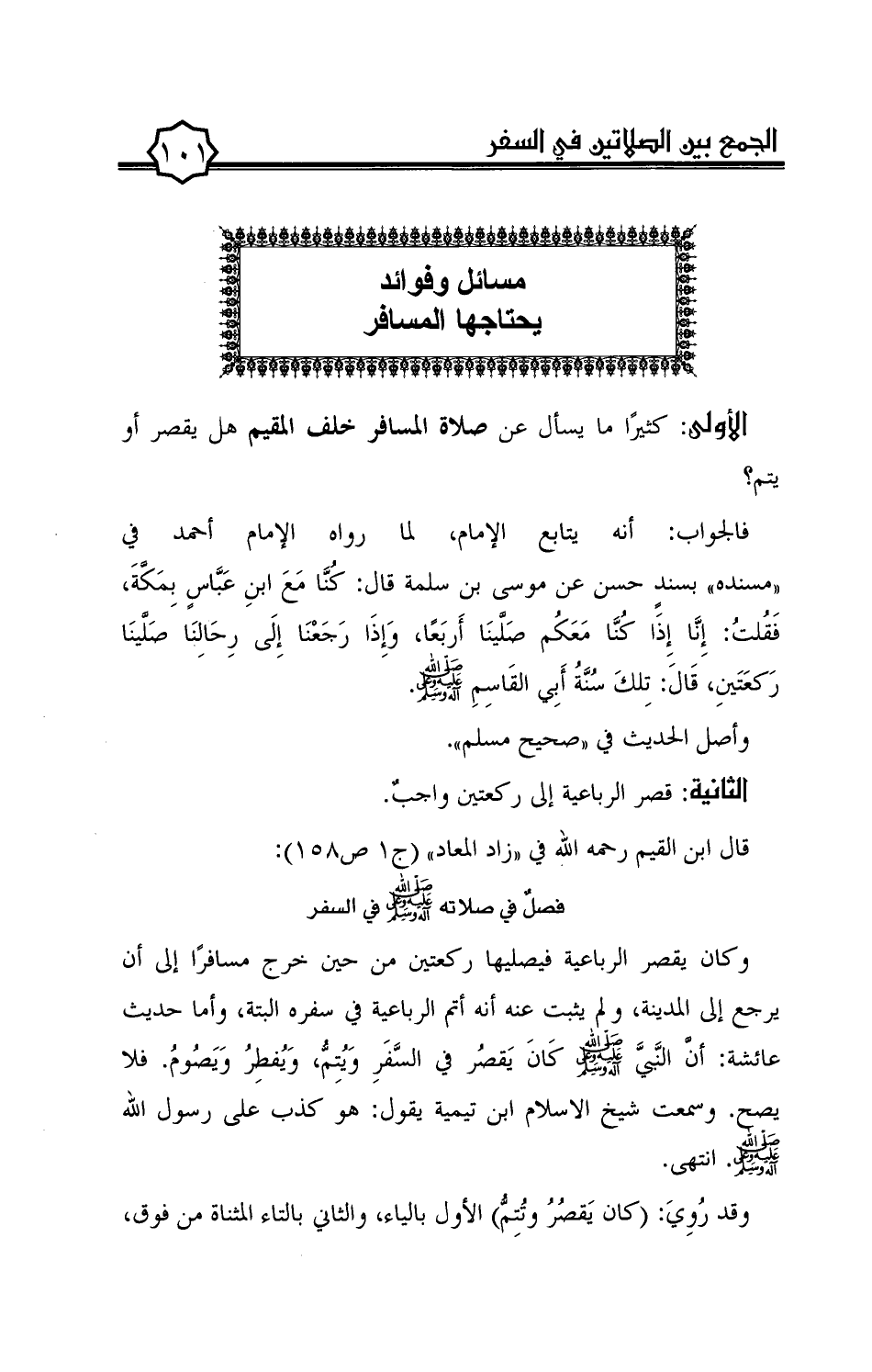 الأولى: كثيرًا ما يسأل عن صلاة المسافر خلف المقيم هل يقصر أو يتم؟