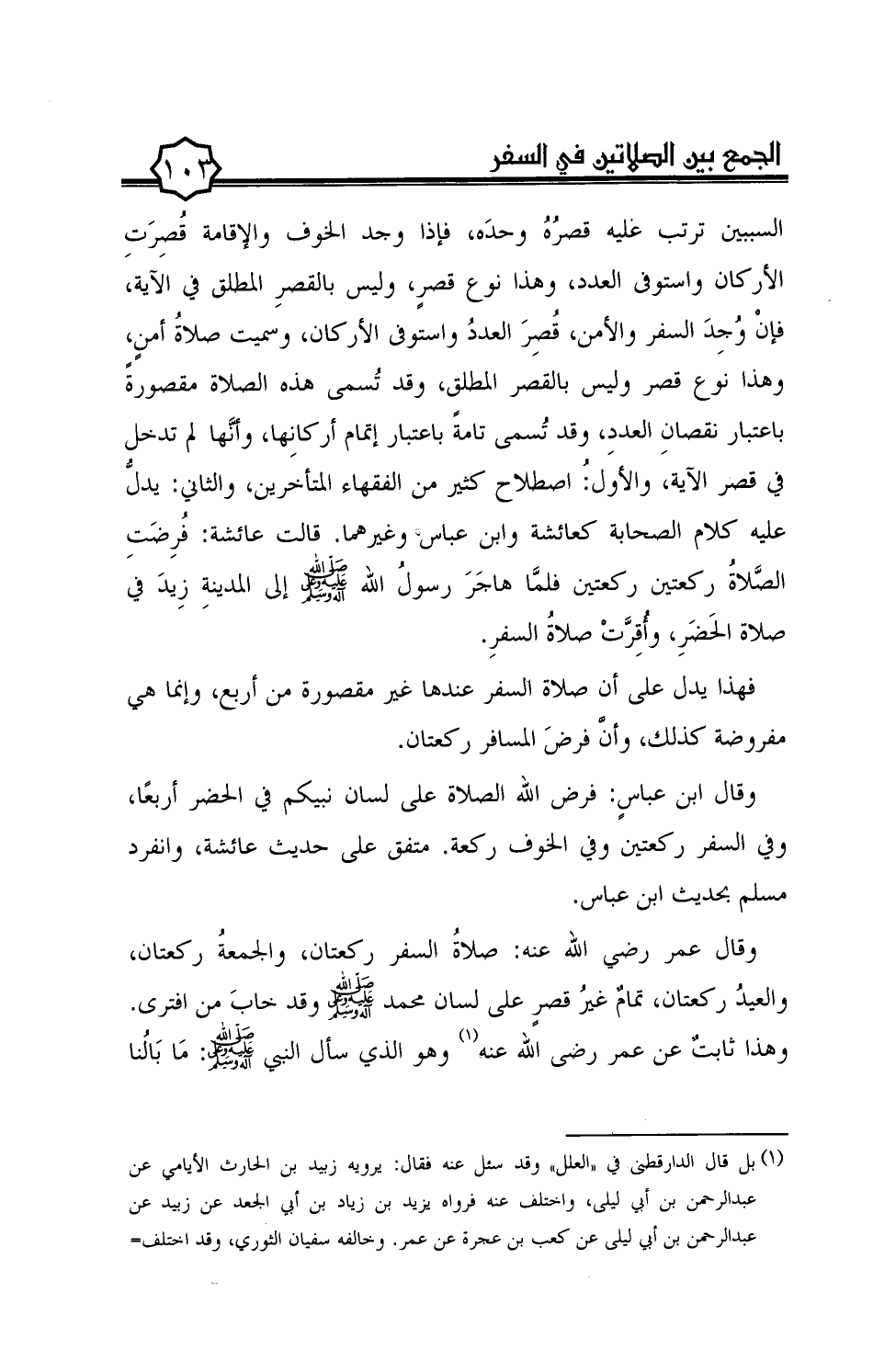 وقال عمر رضي الله عنه: صلاة السفر ركعتان، والجمعة ركعتان، والعيد ركعتان، تمام غير قصر على لسان محمد صلى الله عليه وعلى آله وسلم وقد خاب من افترى. وهذا ثابت عن عمر رضى الله عنه (¬1) وهو الذي سأل النبي صلى الله عليه وعلى آله وسلم: ما بالنا