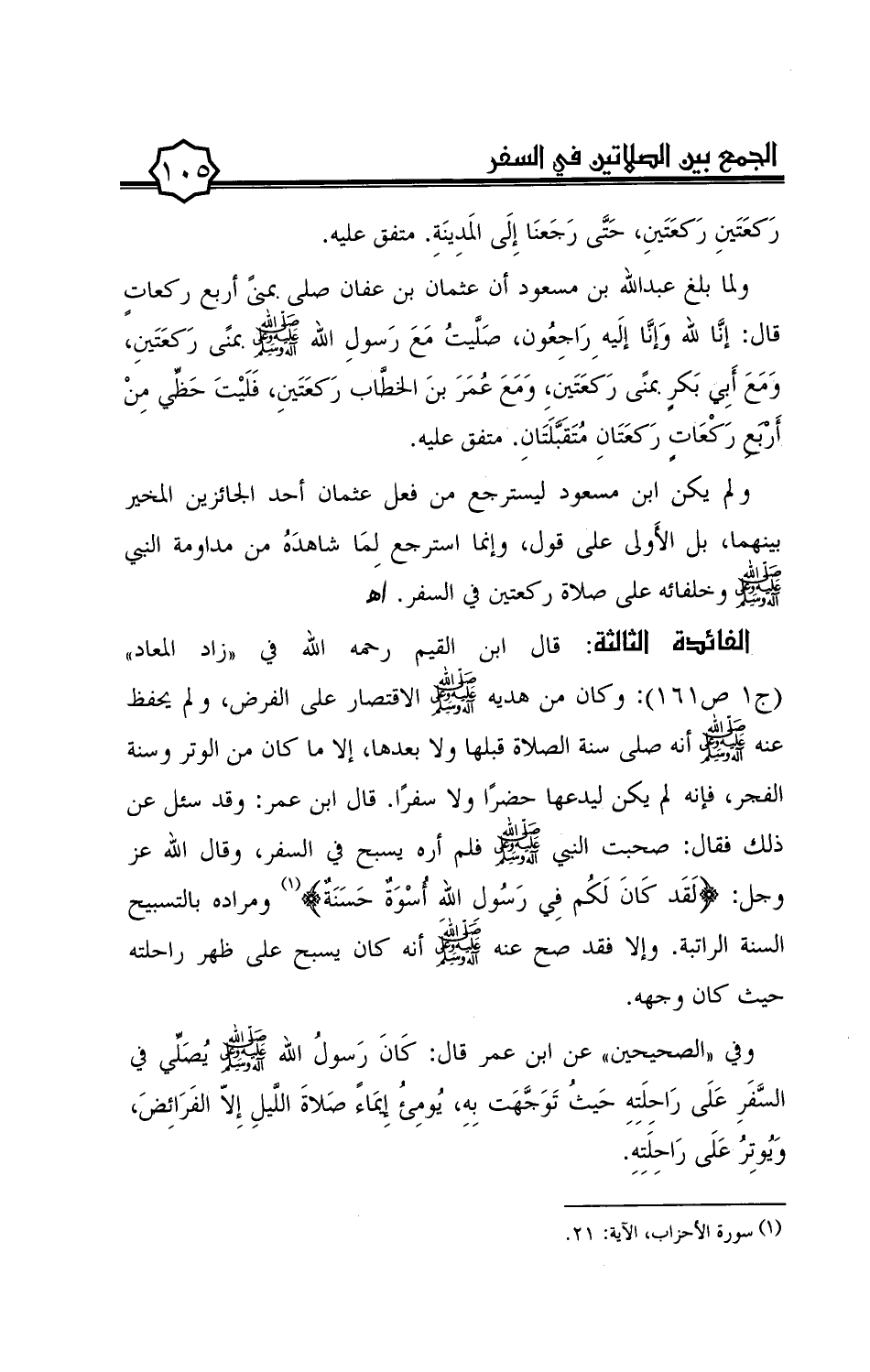 (ج1 ص161): وكان من هديه صلى الله عليه وعلى آله وسلم الاقتصار على الفرض، ولم يحفظ عنه صلى الله عليه وعلى آله وسلم أنه صلى سنة الصلاة قبلها ولا بعدها، إلا ما كان من الوتر وسنة الفجر، فإنه لم يكن ليدعها حضرًا ولا سفرًا. قال ابن عمر: وقد سئل عن ذلك فقال: صحبت النبي صلى الله عليه وعلى آله وسلم فلم أره يسبح في السفر، وقال الله عز وجل: {لقد كان لكم في رسول الله أسْوة حسنة (¬1)} ومراده بالتسبيح السنة الراتبة. وإلا فقد صح عنه صلى الله عليه وعلى آله وسلم أنه كان يسبح على ظهر راحلته حيث كان وجهه.