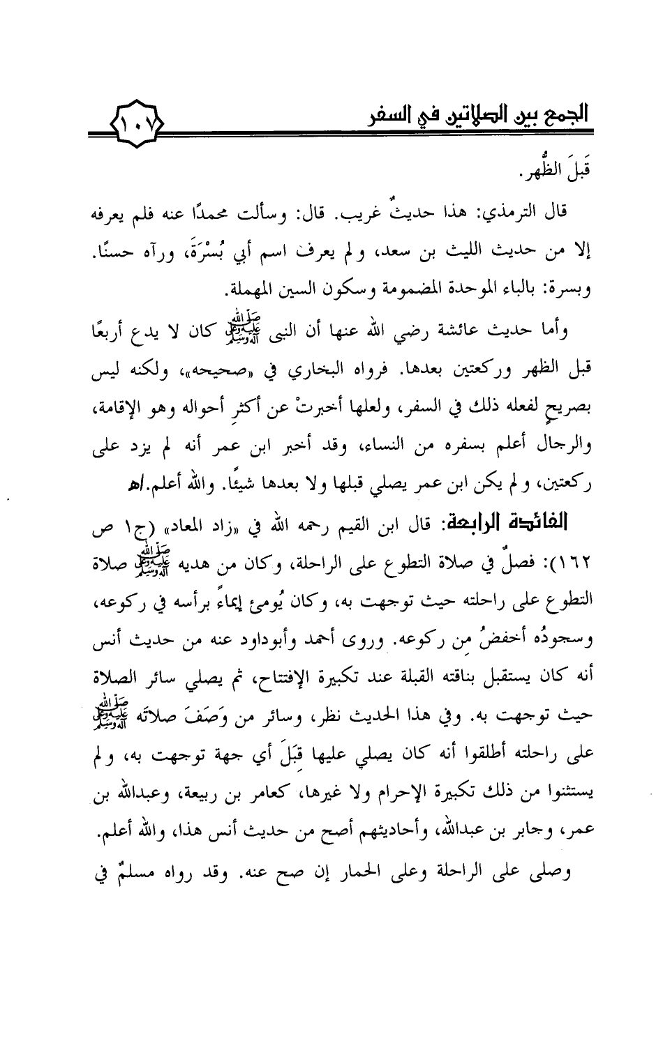 الفائدة الرابعة: قال ابن القيم رحمه الله في "زاد المعاد" (ج1 ص162): فصل في صلاة التطوع على الراحلة، وكان من هديه صلى الله عليه وعلى آله وسلم صلاة التطوع على راحلته حيث توجهت به، وكان يومئ إيماءً برأسه في ركوعه، وسجوده أخفض من ركوعه. وروى أحمد وأبوداود عنه من حديث أنس أنه كان يستقبل بناقته القبلة عند تكبيرة الإفتتاح، ثم يصلي سائر الصلاة حيث توجهت به. وفي هذا الحديث نظر، وسائر من وصف صلاته صلى الله عليه وعلى آله وسلم على راحلته أطلقوا أنه كان يصلي عليها قبل أي جهة توجهت به، ولم يستثنوا من ذلك تكبيرة الإحرام ولا غيرها، كعامر بن ربيعة، وعبد الله بن عمر، وجابر بن عبد الله، وأحاديثهم أصح من حديث أنس هذا، والله أعلم.