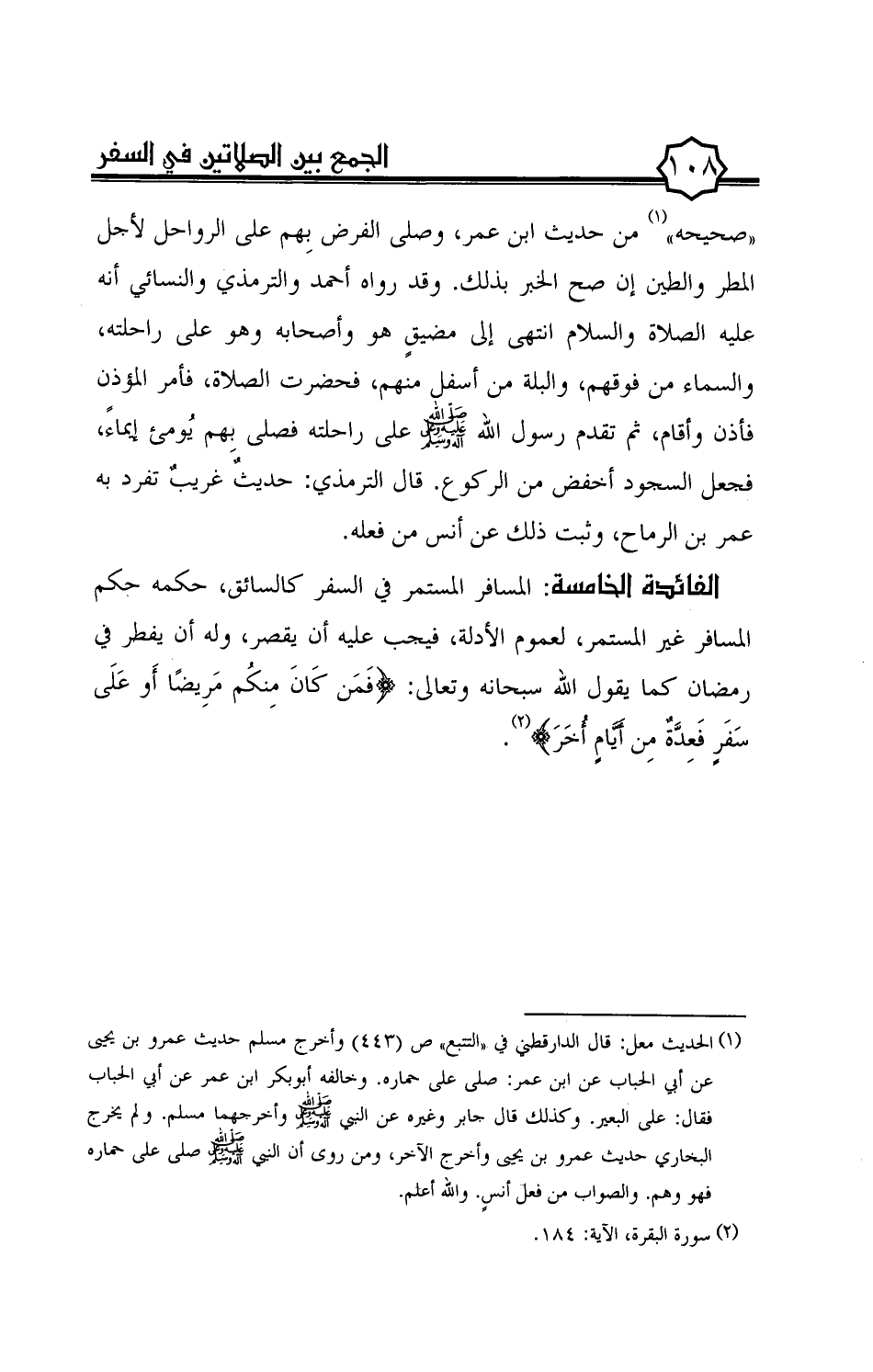 "صحيحه (¬1) " من حديث ابن عمر، وصلى الفرض بهم على الرواحل لأجل المطر والطين إن صح الخبر بذلك. وقد رواه أحمد والترمذي والنسائي أنه عليه الصلاة والسلام انتهى إلى مضيق هو وأصحابه وهو على راحلته، والسماء من فوقهم، والبلة من أسفل منهم، فحضرت الصلاة، فأمر المؤذن فأذن وأقام، ثم تقدم رسول الله صلى الله عليه وعلى آله وسلم على راحلته فصلى بهم يومئ إيماءً، فجعل السجود أخفض من الركوع. قال الترمذي: حديث غريب تفرد به عمر بن الرماح، وثبت ذلك عن أنس من فعله.