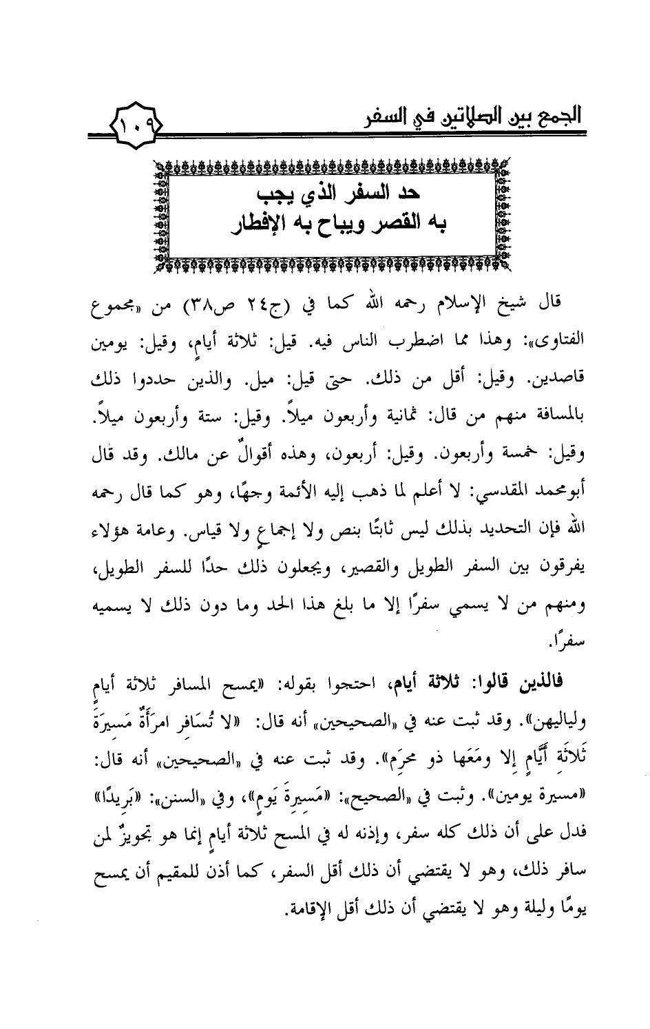 ((مسيرة يومين)). وثبت في "الصحيح": ((مسيرة يوم))، وفي "السنن": ((بريدًا)) فدل على أن ذلك كله سفر، وإذنه له في المسح ثلاثة أيام إنما هو تجويز لمن سافر ذلك، وهو لا يقتضي أن ذلك أقل السفر، كما أذن للمقيم أن يمسح يومًا وليلة وهو لا يقتضي أن ذلك أقل الإقامة.