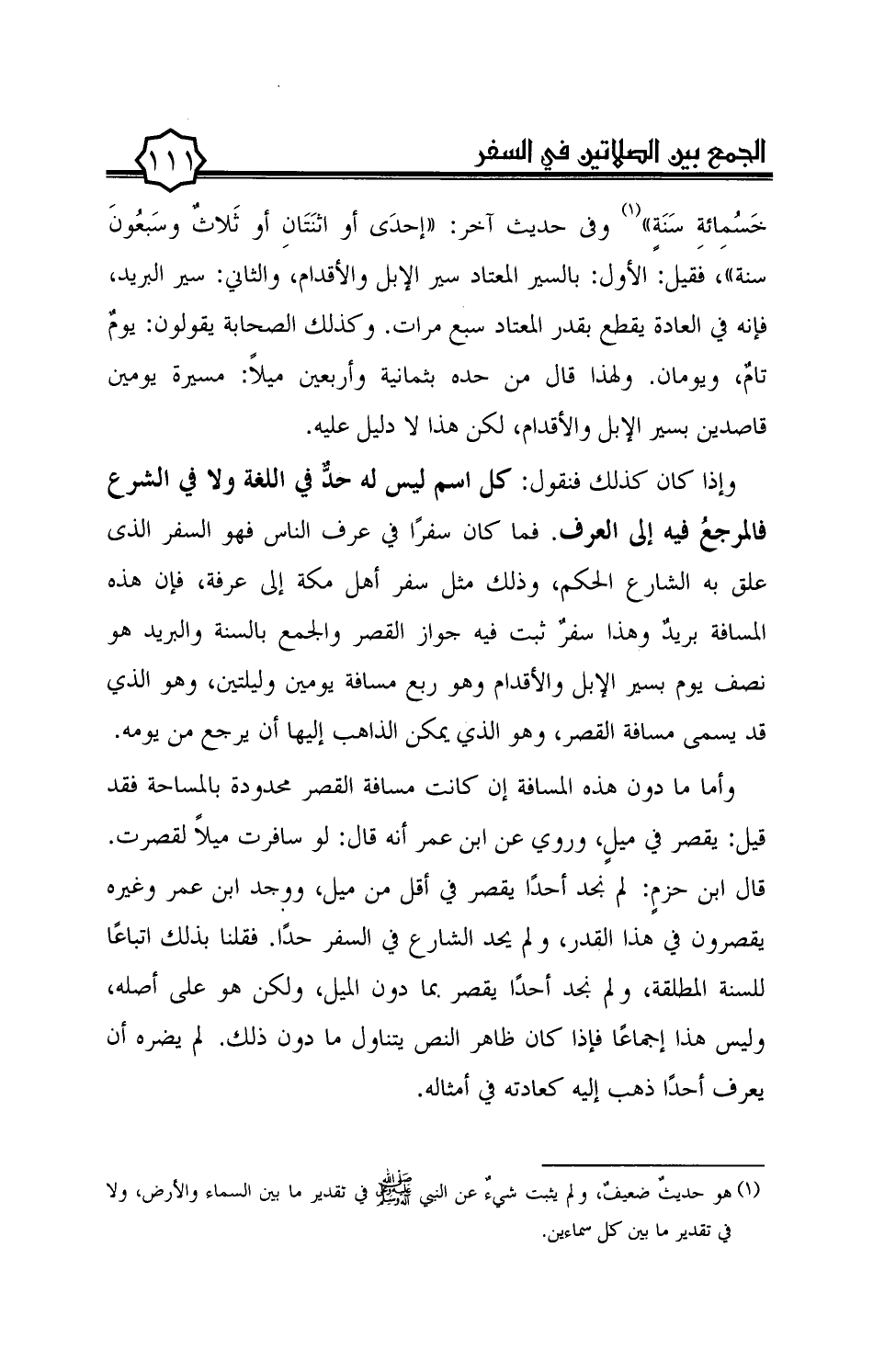 وإذا كان كذلك فنقول: كل اسم ليس له حدّ في اللغة ولا في الشرع فالمرجع فيه إلى العرف. فما كان سفرًا في عرف الناس فهو السفر الذى علق به الشارع الحكم، وذلك مثل سفر أهل مكة إلى عرفة، فإن هذه المسافة بريد وهذا سفر ثبت فيه جواز القصر والجمع بالسنة والبريد هو نصف يوم بسير الإبل والأقدام وهو ربع مسافة يومين وليلتين، وهو الذي قد يسمى مسافة القصر، وهو الذي يمكن الذاهب إليها أن يرجع من يومه.