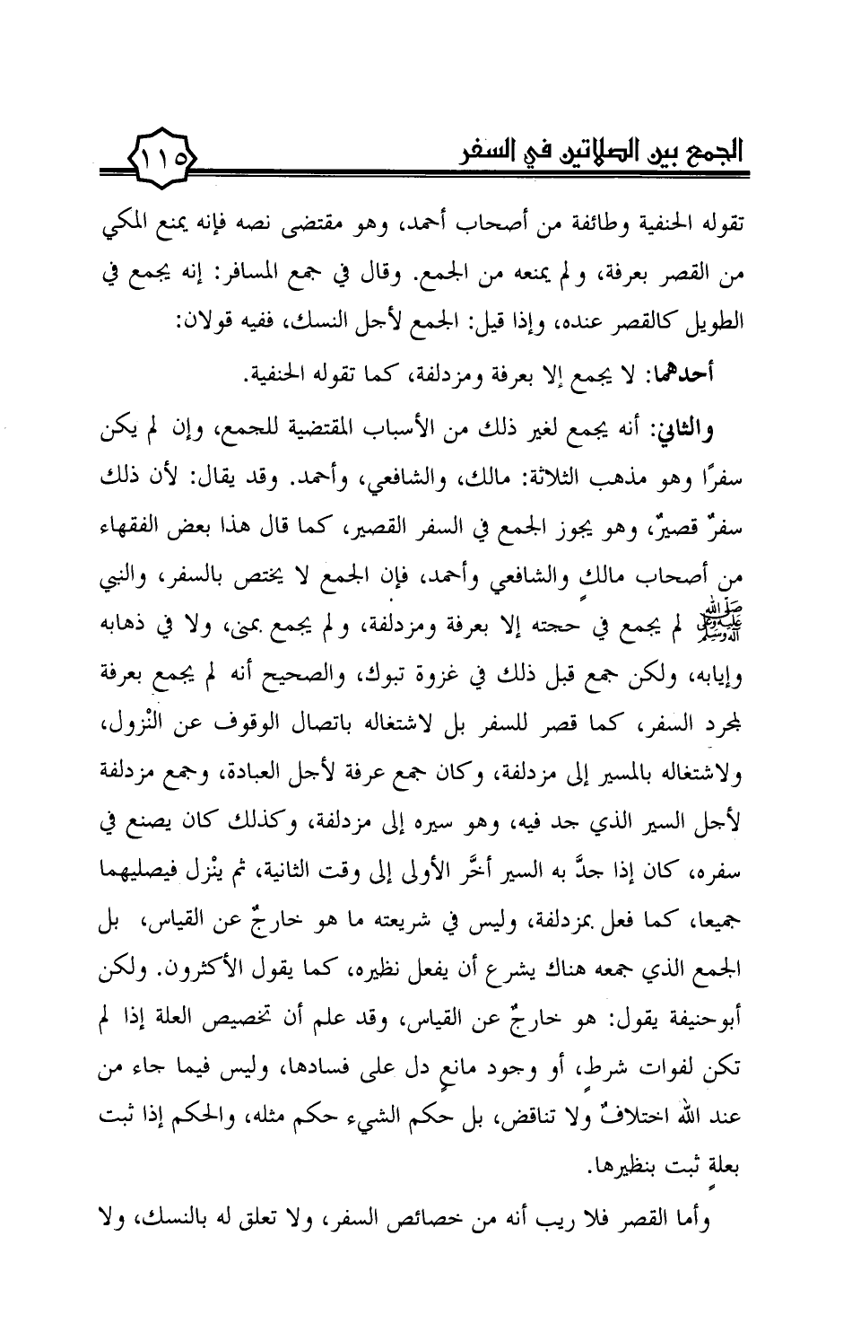 تقوله الحنفية وطائفة من أصحاب أحمد، وهو مقتضى نصه فإنه يمنع المكي من القصر بعرفة، ولم يمنعه من الجمع. وقال في جمع المسافر: إنه يجمع في الطويل كالقصر عنده، وإذا قيل: الجمع لأجل النسك، ففيه قولان: