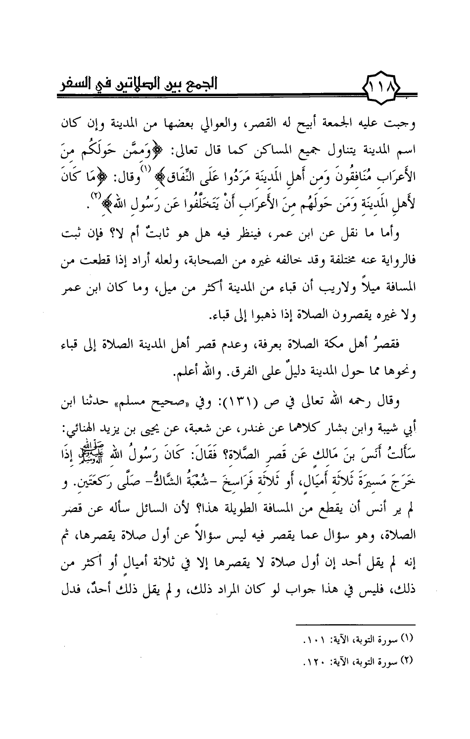 وقال رحمه الله تعالى في ص (131): وفي "صحيح مسلم" حدثنا ابن أبي شيبة وابن بشار كلاهما عن غندر، عن شعبة، عن يحيى بن يزيد الهنائي: سألت أنس بن مالك عن قصر الصّلاة؟ فقال: كان رسول الله صلى الله عليه وعلى آله وسلم إذا خرج مسيرة ثلاثة أميال، أو ثلاثة فراسخ -شعْبة الشّاكّ- صلّى ركعتين. ولم ير أنس أن يقطع من المسافة الطويلة هذا؟ لأن السائل سأله عن قصر الصلاة، وهو سؤال عما يقصر فيه ليس سؤالاً عن أول صلاة يقصرها، ثم إنه لم يقل أحد إن أول صلاة لا يقصرها إلا في ثلاثة أميال أو أكثر من ذلك، فليس في هذا جواب لو كان المراد ذلك، ولم يقل ذلك أحد، فدل