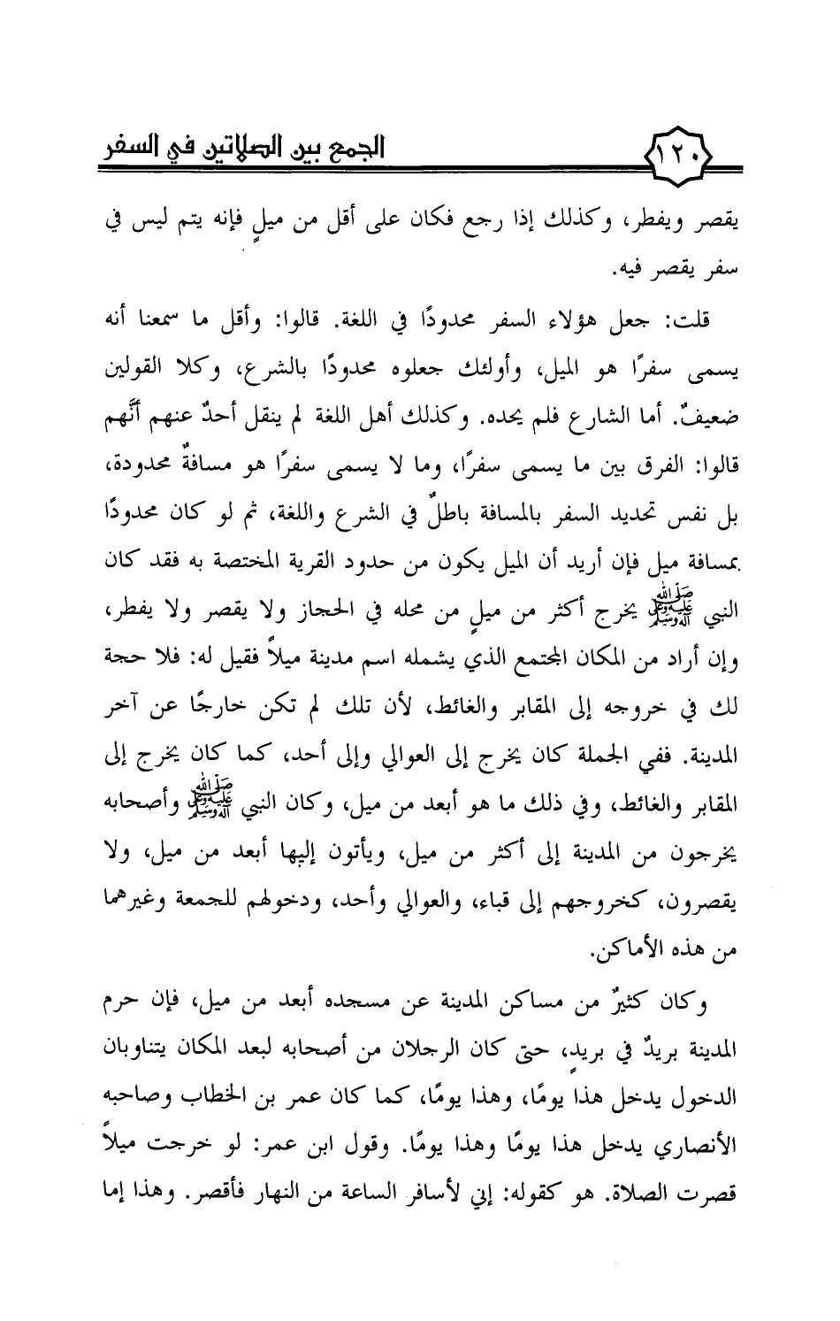 قلت: جعل هؤلاء السفر محدودًا في اللغة. قالوا: وأقل ما سمعنا أنه يسمى سفرًا هو الميل، وأولئك جعلوه محدودًا بالشرع، وكلا القولين ضعيف. أما الشارع فلم يحده. وكذلك أهل اللغة لم ينقل أحد عنهم أنّهم قالوا: الفرق بين ما يسمى سفرًا، وما لا يسمى سفرًا هو مسافة محدودة، بل نفس تحديد السفر بالمسافة باطل في الشرع واللغة، ثم لو كان محدودًا بمسافة ميل فإن أريد أن الميل يكون من حدود القرية المختصة به فقد كان النبي صلى الله عليه وعلى آله وسلم يخرج أكثر من ميل من محله في الحجاز ولا يقصر ولا يفطر، وإن أراد من المكان المجتمع الذي يشمله اسم مدينة ميلاً فقيل له: فلا حجة لك في خروجه إلى المقابر والغائط، لأن تلك لم تكن خارجًا عن آخر المدينة. ففي الجملة كان يخرج إلى العوالي وإلى أحد، كما كان يخرج إلى المقابر والغائط، وفي ذلك ما هو أبعد من ميل، وكان النبي صلى الله عليه وعلى آله وسلم وأصحابه يخرجون من المدينة إلى أكثر من ميل، ويأتون إليها أبعد من ميل، ولا يقصرون، كخروجهم إلى قباء، والعوالي وأحد، ودخولهم للجمعة وغيرهما من هذه الأماكن.