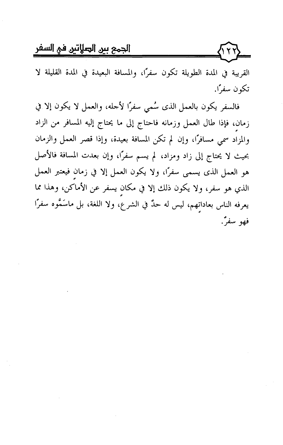القريبة في المدة الطويلة تكون سفرًا، والمسافة البعيدة في المدة القليلة لا تكون سفرًا.