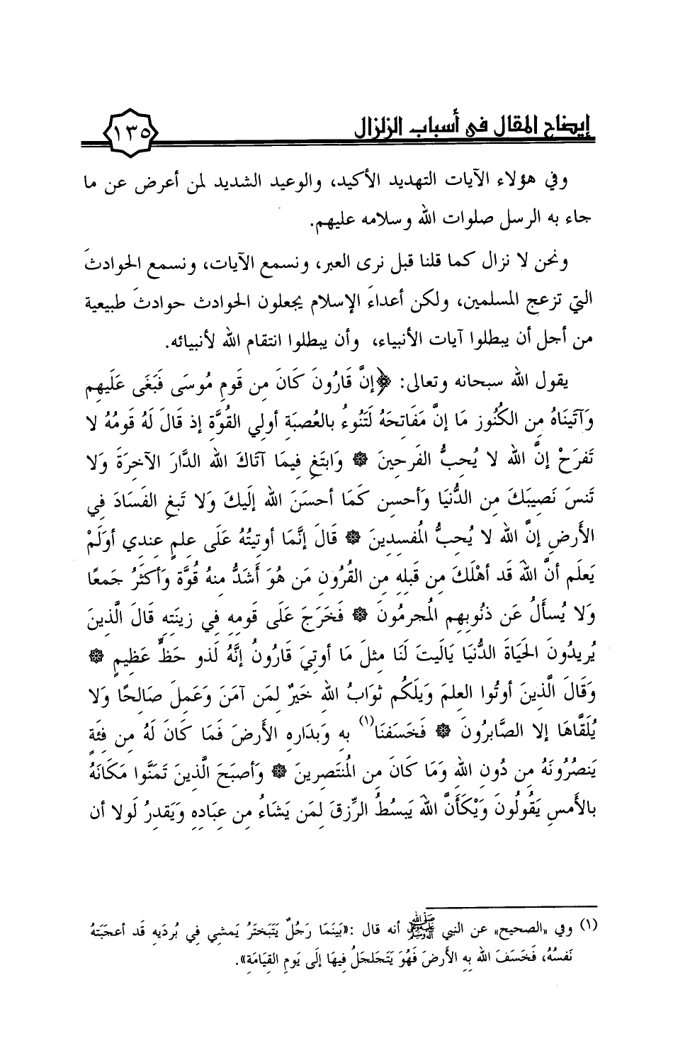 يقول الله سبحانه وتعالى: {إنّ قارون كان من قوم موسى فبغى عليهم وآتيناه من الكنوز ما إنّ مفاتحه لتنوء بالعصبة أولي القوّة إذ قال له قومه لا تفرحْ إنّ الله لا يحبّ الفرحين * وابتغ فيما آتاك الله الدّار الآخرة ولا تنس نصيبك من الدّنيا وأحسن كما أحسن الله إليك ولا تبغ الفساد في الأرض إنّ الله لا يحبّ المفسدين * قال إنّما أوتيته على علم عندي أولمْ يعلم أنّ الله قد أهْلك من قبله من القرون من هو أشدّ منه قوّة وأكثر جمعًا ولا يسأل عن ذنوبهم المجرمون * فخرج على قومه في زينته قال الّذين يريدون الحياة الدّنيا ياليت لنا مثل ما أوتي قارون إنّه لذو حظّ عظيم * وقال الّذين أوتوا العلم ويلكم ثواب الله خير لمن آمن وعمل صالحًا ولا يلقّاها إلا الصّابرون * فخسفنا (¬1) به وبداره الأرض فما كان له من فئة ينصرونه من دون الله وما كان من المنتصرين * وأصبح الّذين تمنّوا مكانه بالأمس يقولون ويْكأنّ الله يبسط الرّزق لمن يشاء من عباده ويقدر لولا أن