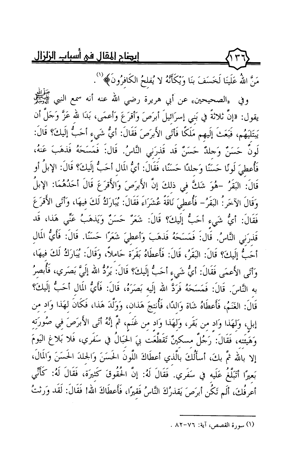 وفي "الصحيحين" عن أبي هريرة رضي الله عنه أنه سمع النبي صلى الله عليه وعلى آله وسلم يقول: ((إنّ ثلاثةً في بني إسرائيل أبرص وأقرع وأعمى، بدا لله عزّ وجلّ أن يبتليهم، فبعث إليهم ملكًا فأتى الأبرص فقال: أيّ شيء أحبّ إليك؟ قال: لون حسن وجلد حسن قد قذرني النّاس. قال: فمسحه فذهب عنه، فأعطي لونًا حسنًا وجلدًا حسنًا، فقال: أيّ المال أحبّ إليك؟ قال: الإبل أو قال: البقر -هو شكّ في ذلك إنّ الأبرص والأقرع قال أحدهما: الإبل وقال الآخر: البقر- فأعطي ناقةً عشراء فقال: يبارك لك فيها، وأتى الأقرع فقال: أيّ شيء أحبّ إليك؟ قال: شعر حسن ويذهب عنّي هذا، قد قذرني النّاس. قال: فمسحه فذهب وأعطي شعرًا حسنًا. قال: فأيّ المال أحبّ إليك؟ قال: البقر، قال: فأعطاه بقرة حاملاً، وقال: يبارك لك فيها، وأتى الأعمى فقال: أيّ شيء أحبّ إليك؟ قال: يردّ الله إليّ بصري، فأبصر به النّاس. قال: فمسحه فردّ الله إليه بصره، قال: فأيّ المال أحبّ إليك؟ قال: الغنم، فأعطاه شاة والدًا، فأنتج هذان، وولّد هذا، فكان لهذا واد من إبل، ولهذا واد من بقر، ولهذا واد من غنم، ثمّ إنّه أتى الأبرص في صورته وهيئته، فقال: رجل مسكين تقطّعت بي الحبال في سفري، فلا بلاغ اليوم إلا بالله ثمّ بك، أسألك بالّذي أعطاك اللّون الحسن والجلد الحسن والمال، بعيرًا أتبلّغ عليه في سفري. فقال له: إنّ الحقوق كثيرة، فقال له: كأنّي أعرفك، ألم تكن أبرص يقذرك النّاس فقيرًا، فأعطاك الله! فقال: لقد ورثت