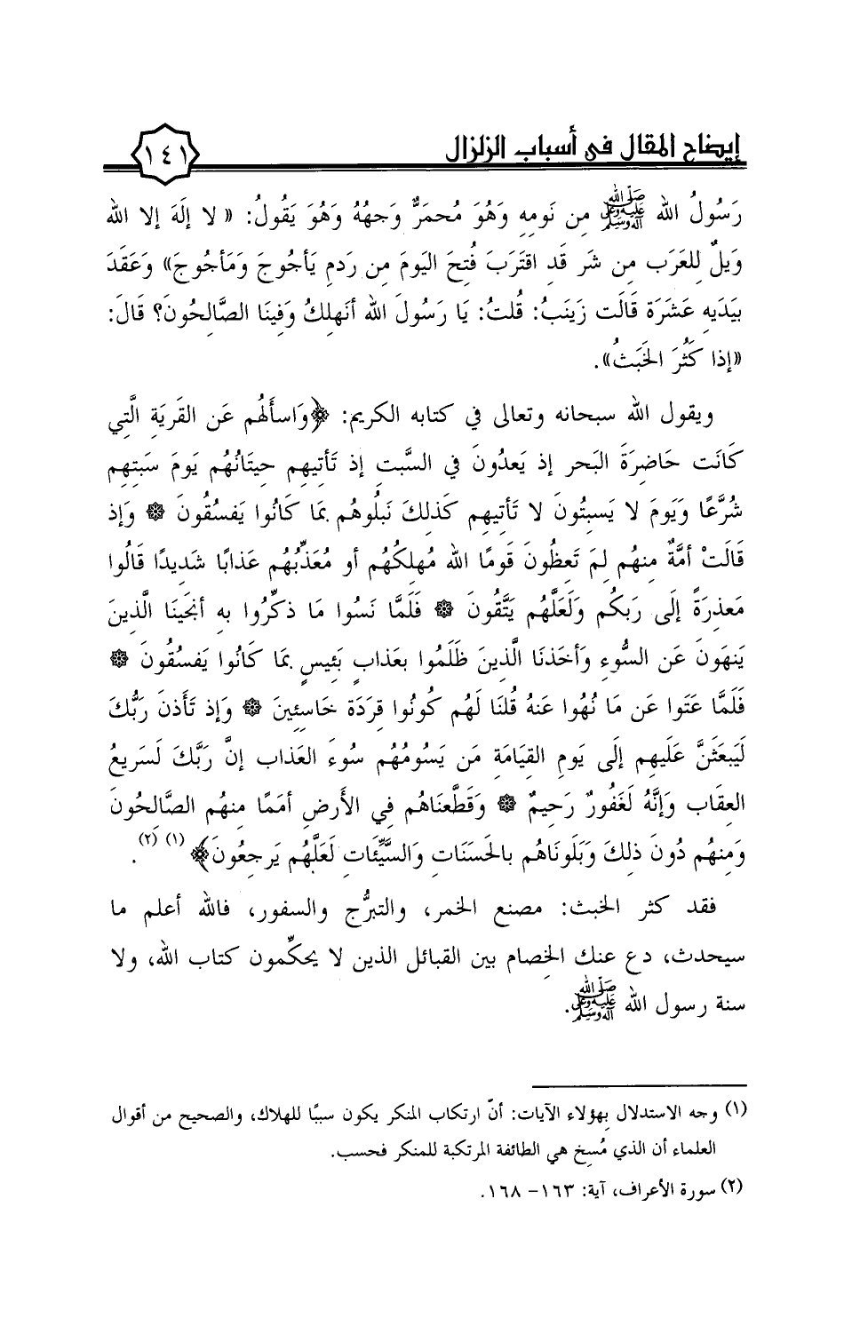 (¬1) وجه الاستدلال بِهؤلاء الآيات: أنّ ارتكاب المنكر يكون سببًا للهلاك، والصحيح من أقوال العلماء أن الذي مُسِخ هي الطائفة المرتكبة للمنكر فحسب.
