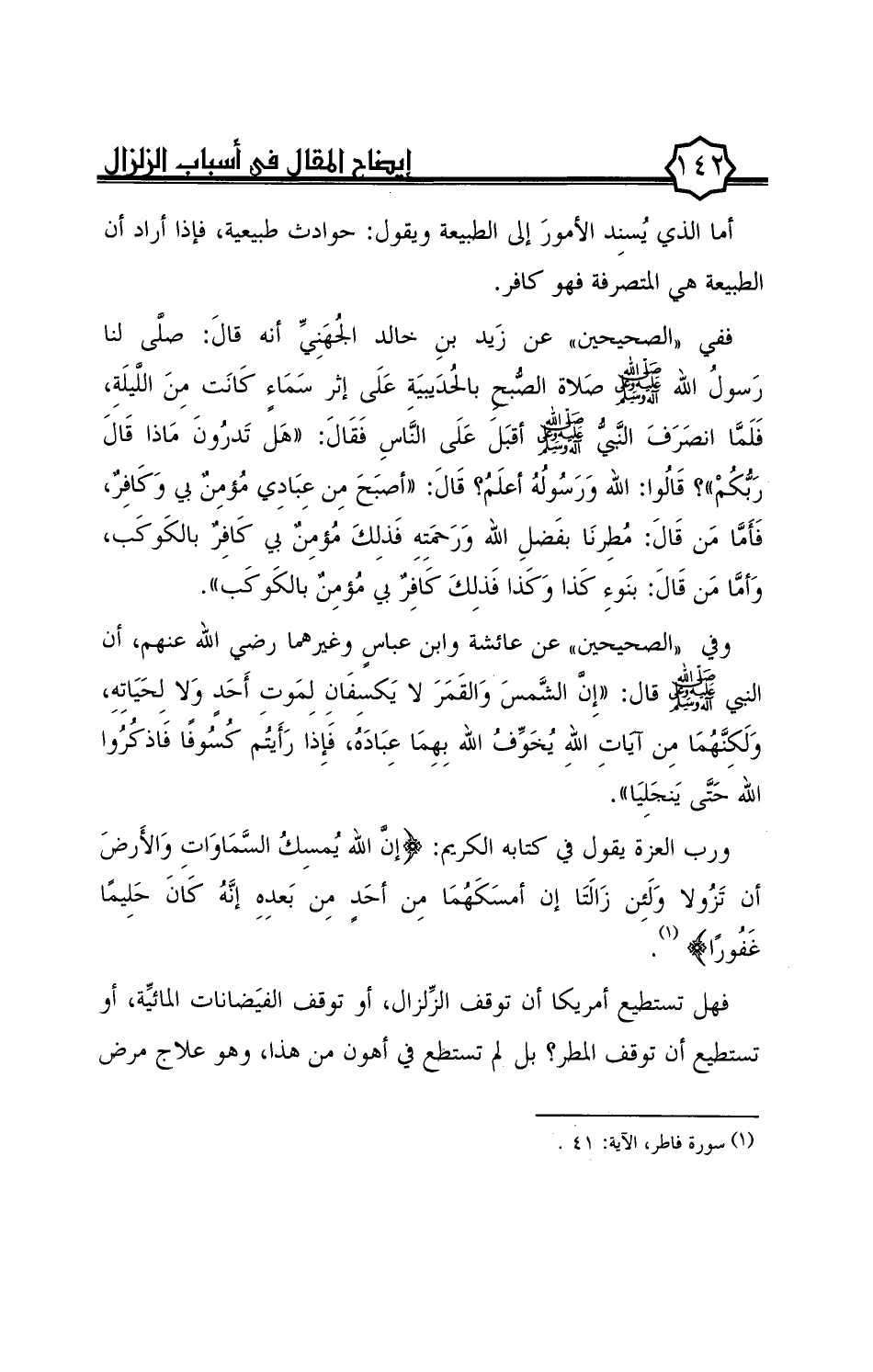 ففي "الصحيحين" عن زيد بن خالد الجهنيّ أنه قال: صلّى لنا رسول الله صلى الله عليه وعلى آله وسلم صلاة الصّبح بالحديبية على إثر سماء كانت من اللّيلة، فلمّا انصرف النّبيّ صلى الله عليه وعلى آله وسلم أقبل على النّاس فقال: ((هل تدرون ماذا قال ربّكمْ))؟ قالوا: الله ورسوله أعلم؟ قال: ((أصبح من عبادي مؤمن بي وكافر، فأمّا من قال: مطرنا بفضل الله ورحمته فذلك مؤمن بي كافر بالكوكب، وأمّا من قال: بنوء كذا وكذا فذلك كافر بي مؤمن بالكوكب)).