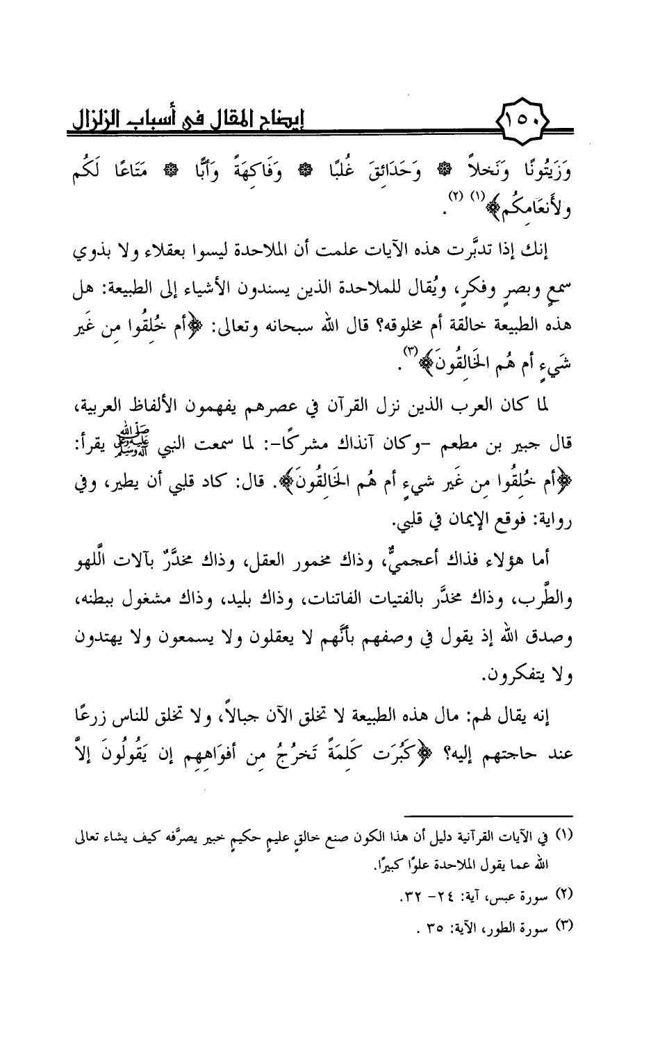 إنك إذا تدبّرت هذه الآيات علمت أن الملاحدة ليسوا بعقلاء ولا بذوي سمع وبصر وفكر، ويقال للملاحدة الذين يسندون الأشياء إلى الطبيعة: هل هذه الطبيعة خالقة أم مخلوقه؟ قال الله سبحانه وتعالى: {أم خلقوا من غير شيء أم هم الخالقون (¬3)}.
