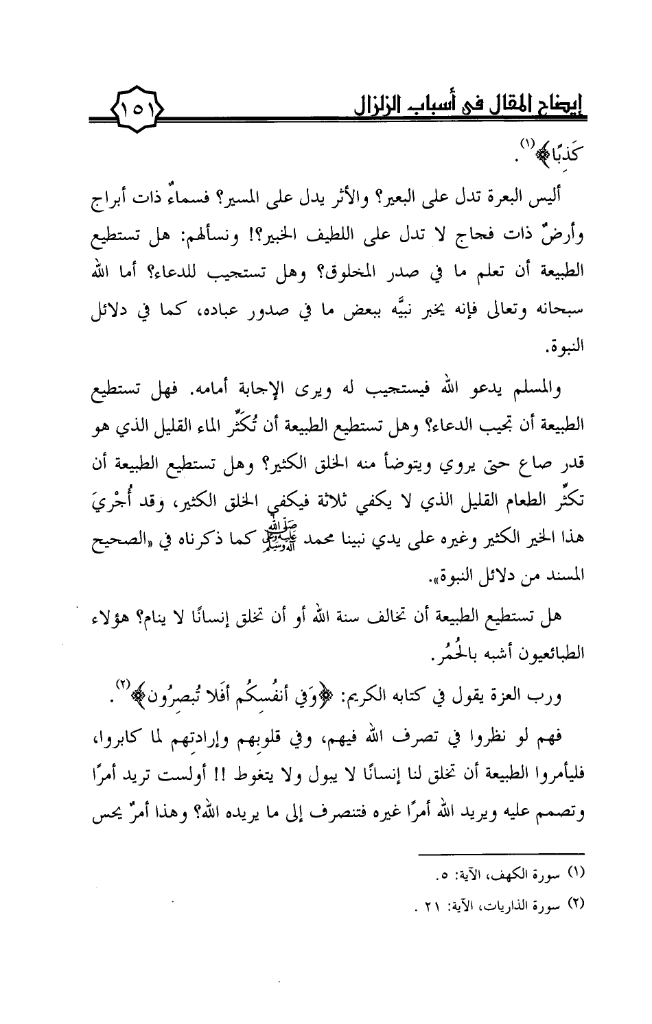 أليس البعرة تدل على البعير؟ والأثر يدل على المسير؟ فسماء ذات أبراج وأرض ذات فجاج لا تدل على اللطيف الخبير؟! ونسألهم: هل تستطيع الطبيعة أن تعلم ما في صدر المخلوق؟ وهل تستجيب للدعاء؟ أما الله سبحانه وتعالى فإنه يخبر نبيّه ببعض ما في صدور عباده، كما في دلائل النبوة.