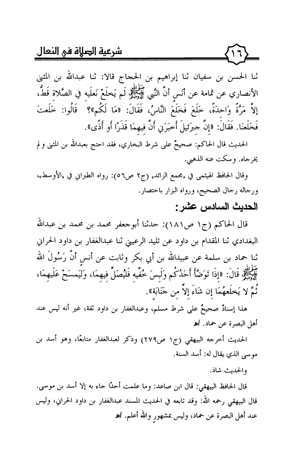 ثنا الحسن بن سفيان ثنا إبراهيم بن الحجاج قالا: ثنا عبد الله بن المثنى الأنصاري عن ثمامة عن أنس أنّ النّبي صلى الله عليه وعلى آله وسلم لم يخلعْ نعليه في الصّلاة قطّ، إلاّ مرّةً واحدةً، خلع فخلع النّاس، فقال: ((ما لكم))؟ قالوا: خلعت فخلعنا. فقال: ((إنّ جبرئيل أخبرني أنّ فيهما قذرًا أو أذًى)).