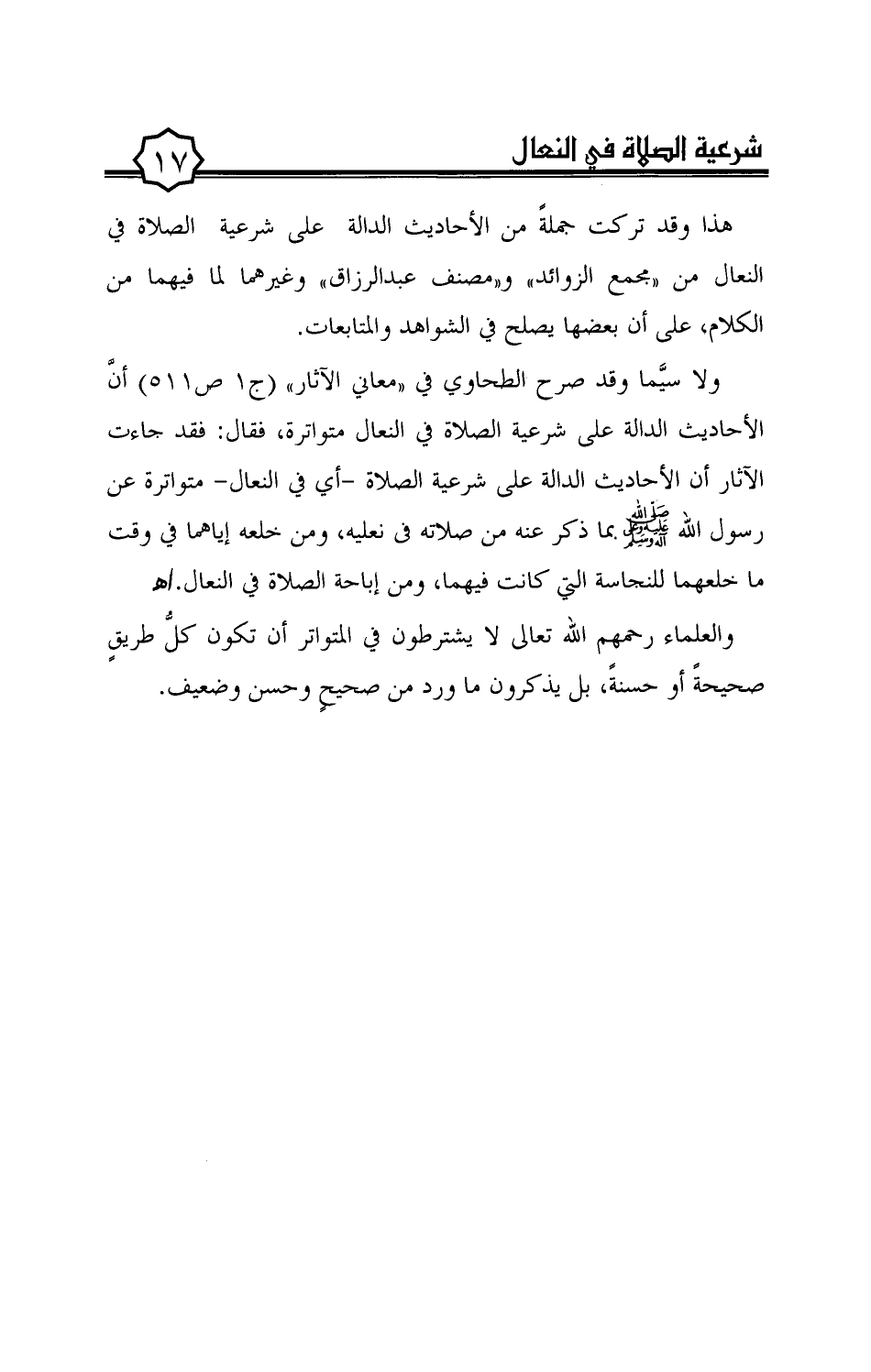 ولا سيّما وقد صرح الطحاوي في "معاني الآثار" (ج1 ص511) أنّ الأحاديث الدالة على شرعية الصلاة في النعال متواترة، فقال: فقد جاءت الآثار أن الأحاديث الدالة على شرعية الصلاة -أي في النعال- متواترة عن رسول الله صلى الله عليه وعلى آله وسلم بما ذكر عنه من صلاته فى نعليه، ومن خلعه إياهما في وقت ما خلعهما للنجاسة التي كانت فيهما، ومن إباحة الصلاة في النعال. اهـ