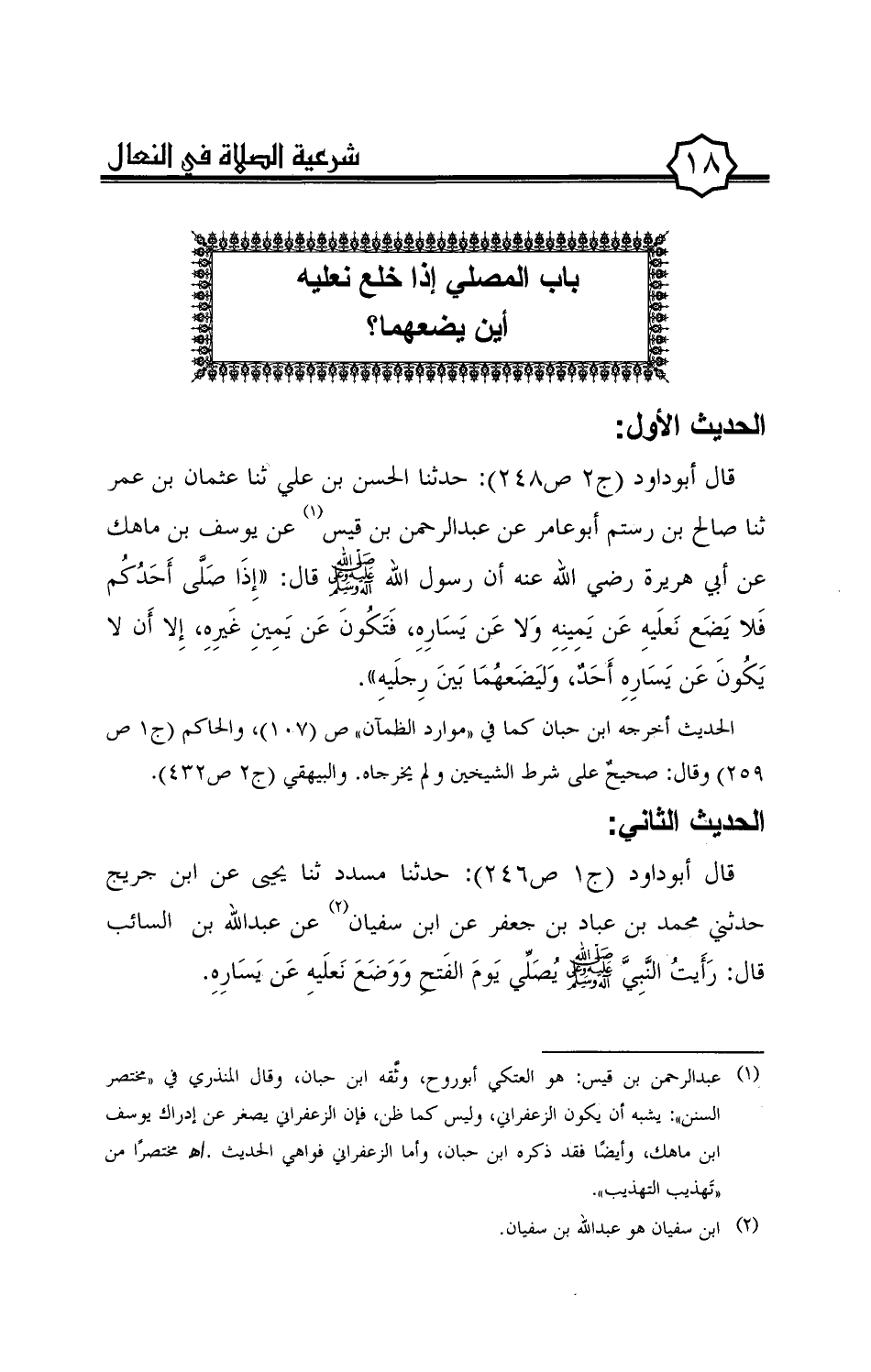 قال أبوداود (ج2 ص248): حدثنا الحسن بن علي ثنا عثمان بن عمر ثنا صالح بن رستم أبوعامر عن عبد الرحمن بن قيس (¬1) عن يوسف بن ماهك عن أبي هريرة رضي الله عنه أن رسول الله صلى الله عليه وعلى آله وسلم قال: ((إذا صلّى أحدكم فلا يضع نعليه عن يمينه ولا عن يساره، فتكون عن يمين غيره، إلا أن لا يكون عن يساره أحد، وليضعهما بين رجليه)).