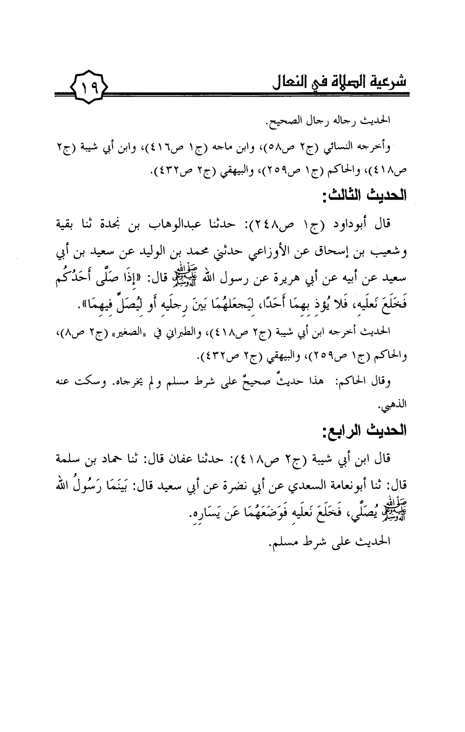 قال أبوداود (ج1 ص248): حدثنا عبد الوهاب بن نجدة ثنا بقية وشعيب بن إسحاق عن الأوزاعي حدثني محمد بن الوليد عن سعيد بن أبي سعيد عن أبيه عن أبي هريرة عن رسول الله صلى الله عليه وعلى آله وسلم قال: ((إذا صلّى أحدكم فخلع نعليه، فلا يؤذ بهما أحدًا، ليجعلهما بين رجليه أو ليصلّ فيهما)).