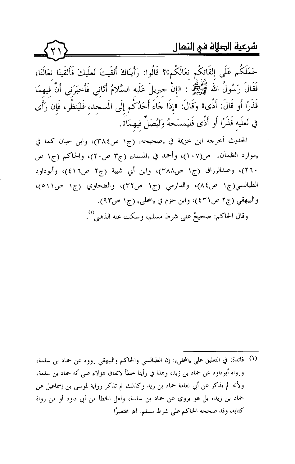 (¬1) فائدة: في التعليق على "المحلى": إن الطيالسي والحاكم والبيهقي رووه عن حماد بن سلمة، ورواه أبوداود عن حماد بن زيد، وهذا في رأينا خطأ لاتفاق هؤلاء على أنه حماد بن سلمة، ولأنه لم يذكر عن أبي نعامة حماد بن زيد وكذلك لم تذكر رواية لموسى بن إسماعيل عن حماد بن زيد، بل هو يروي عن حماد بن سلمة، ولعل الخطأ من أبي داود أو من رواة كتابه، وقد صححه الحاكم على شرط مسلم. اهـ مختصرًا