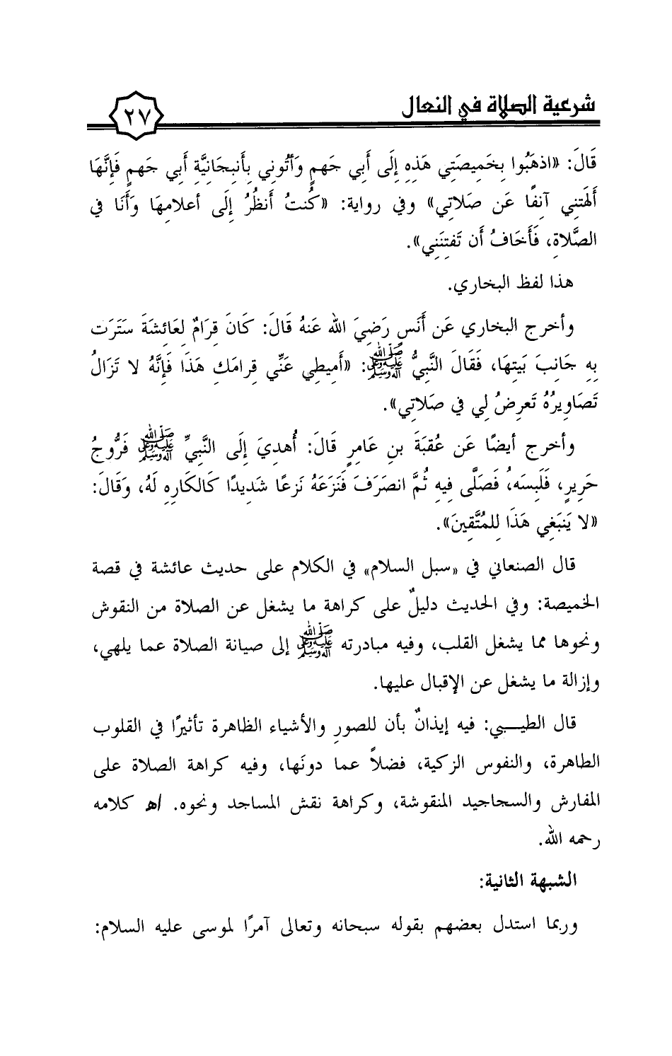قال: ((اذهبوا بخميصتي هذه إلى أبي جهم وأتوني بأنبجانيّة أبي جهم فإنّها ألهتني آنفًا عن صلاتي)) وفي رواية: ((كنت أنظر إلى أعلامها وأنا في الصّلاة، فأخاف أن تفتنني)).