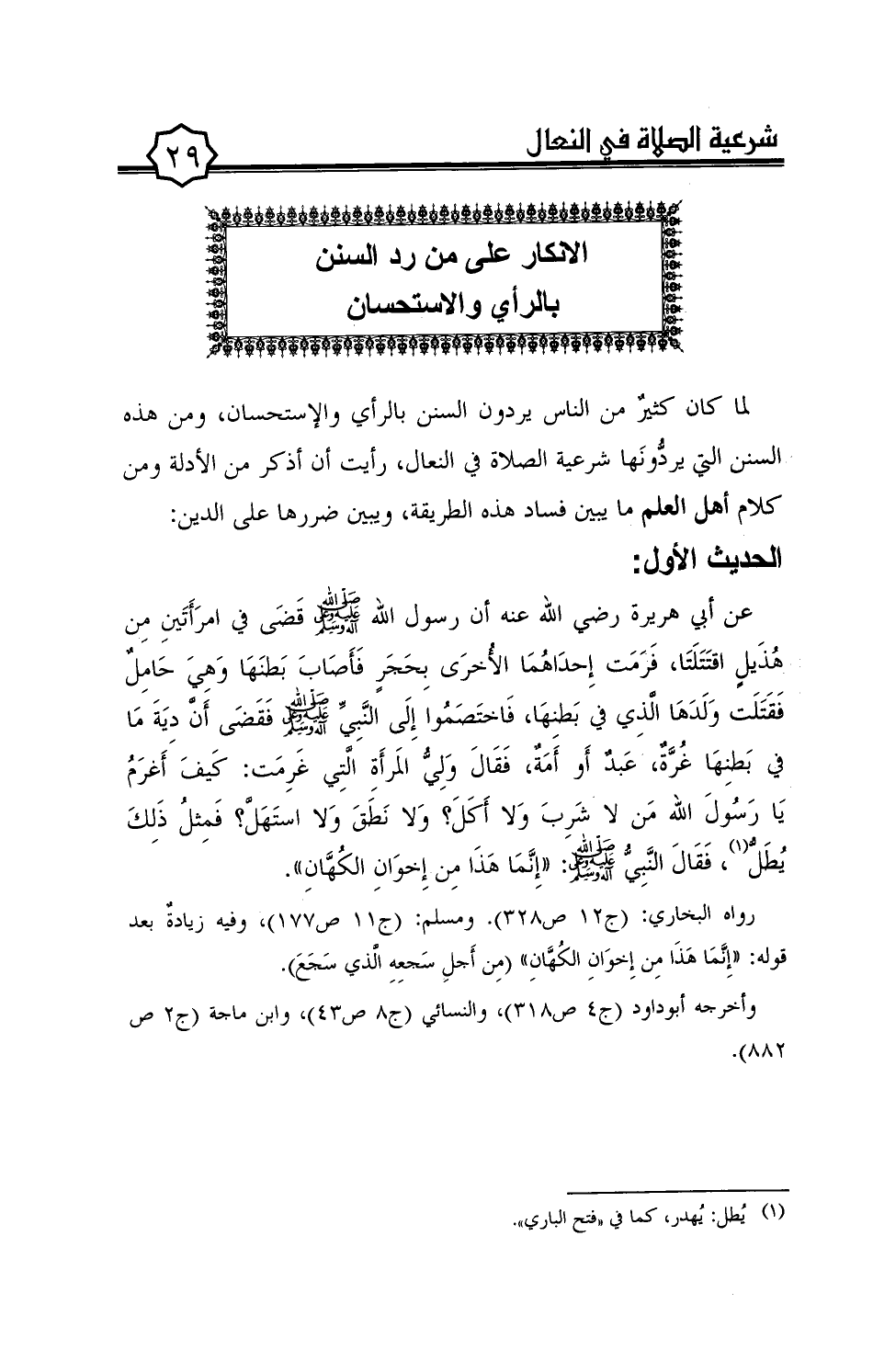 لما كان كثير من الناس يردون السنن بالرأي والإستحسان، ومن هذه السنن التي يردّونها شرعية الصلاة في النعال، رأيت أن أذكر من الأدلة ومن كلام أهل العلم ما يبين فساد هذه الطريقة، ويبين ضررها على الدين: