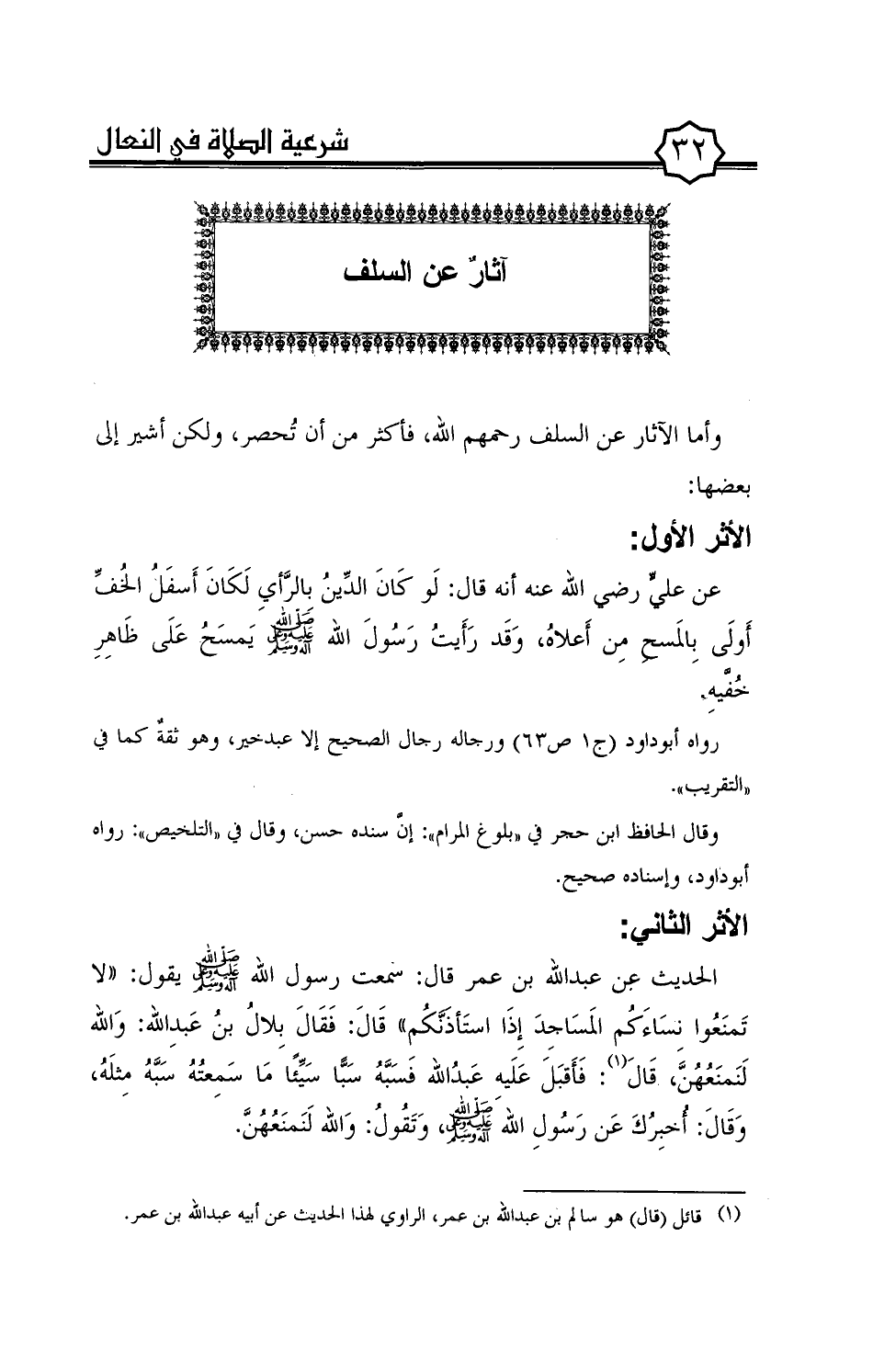 عن عليّ رضي الله عنه أنه قال: لو كان الدّين بالرّأي لكان أسفل الخفّ أولى بالمسح من أعلاه، وقد رأيت رسول الله صلى الله عليه وعلى آله وسلم يمسح على ظاهر خفّيه.