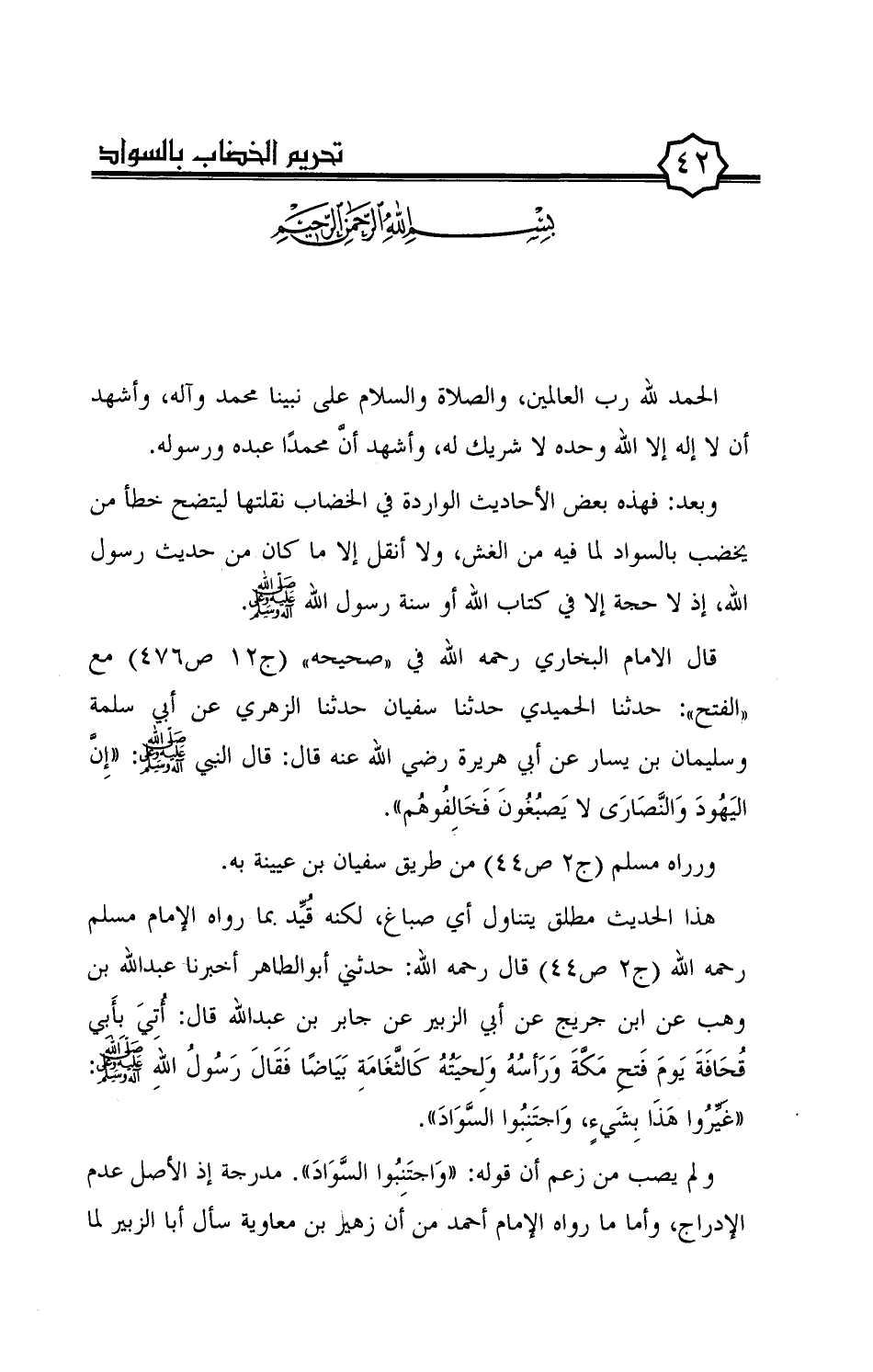 قال الامام البخاري رحمه الله في "صحيحه" (ج12 ص476) مع "الفتح": حدثنا الحميدي حدثنا سفيان حدثنا الزهري عن أبي سلمة وسليمان بن يسار عن أبي هريرة رضي الله عنه قال: قال النبي صلى الله عليه وعلى آله وسلم: ((إنّ اليهود والنّصارى لا يصبغون فخالفوهم)).