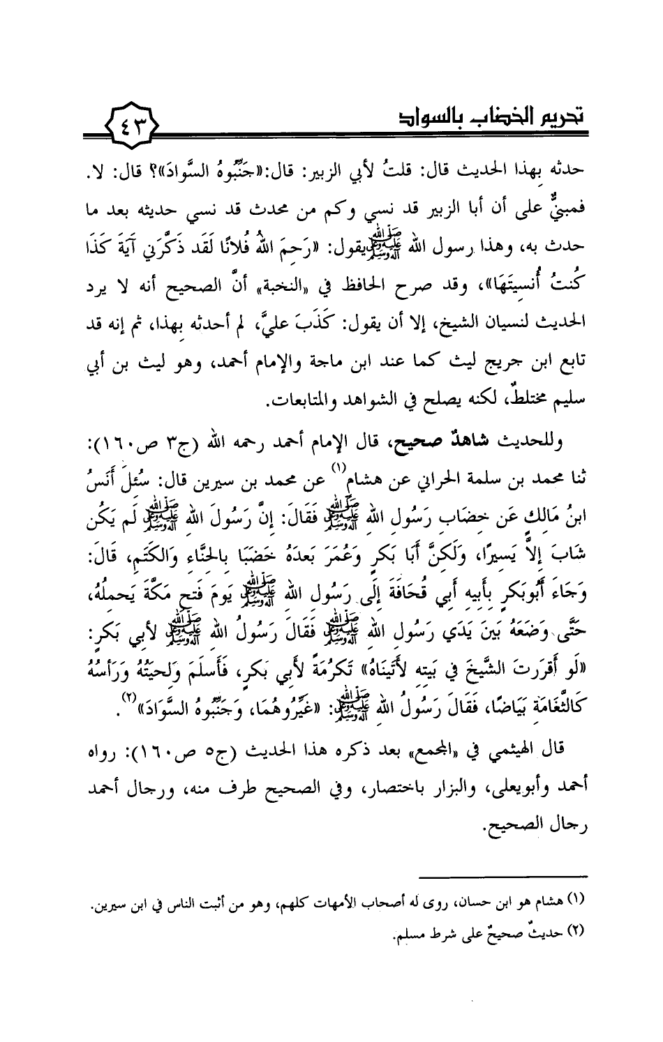 وللحديث شاهد صحيح، قال الإمام أحمد رحمه الله (ج3 ص160): ثنا محمد بن سلمة الحراني عن هشام (¬1) عن محمد بن سيرين قال: سئل أنس ابن مالك عن خضاب رسول الله صلى الله عليه وعلى آله وسلم فقال: إنّ رسول الله صلى الله عليه وعلى آله وسلم لم يكن شاب إلاّ يسيرًا، ولكنّ أبا بكر وعمر بعده خضبا بالحنّاء والكتم، قال: وجاء أبوبكر بأبيه أبي قحافة إلى رسول الله صلى الله عليه وعلى آله وسلم يوم فتح مكّة يحمله، حتّى وضعه بين يدي رسول الله صلى الله عليه وعلى آله وسلم فقال رسول الله صلى الله عليه وعلى آله وسلم لأبي بكر: ((لو أقررت الشّيخ في بيته لأتيناه)) تكرمةً لأبي بكر، فأسلم ولحيته ورأسه كالثّغامة بياضًا، فقال رسول الله صلى الله عليه وعلى آله وسلم: ((غيّروهما، وجنّبوه السّواد (¬2)).