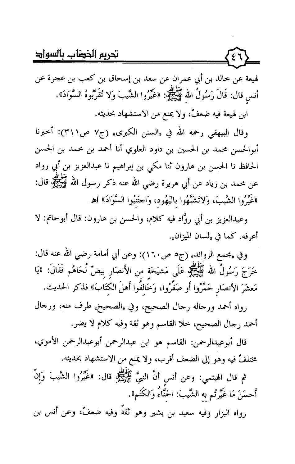 وقال البيهقي رحمه الله في "السنن الكبرى" (ج7 ص311): أخبرنا أبوالحسن محمد بن الحسين بن داود العلوي أنا أحمد بن محمد بن الحسن الحافظ نا الحسن بن هارون ثنا مكي بن إبراهيم نا عبد العزيز بن أبي رواد عن محمد بن زياد عن أبي هريرة رضي الله عنه ذكر رسول الله صلى الله عليه وعلى آله وسلم قال: ((غيّروا الشّيب، ولاتشبّهوا باليهود، واجتنبوا السّواد)) اهـ