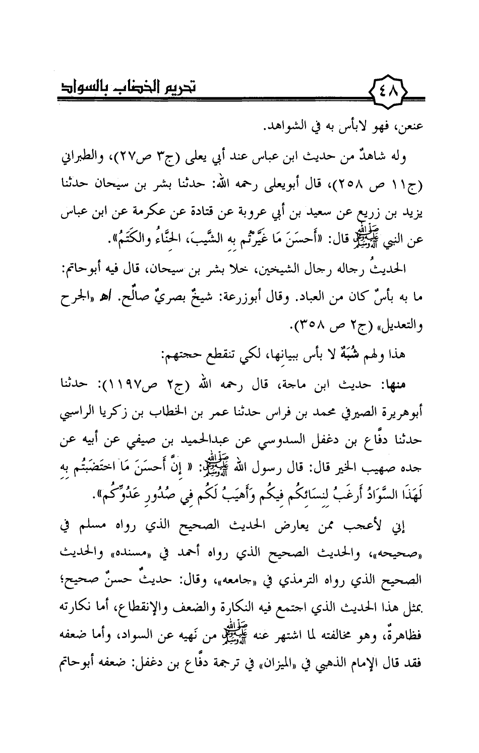 إني لأعجب ممن يعارض الحديث الصحيح الذي رواه مسلم في "صحيحه"، والحديث الصحيح الذي رواه أحمد في "مسنده" والحديث الصحيح الذي رواه الترمذي في "جامعه"، وقال: حديث حسن صحيح؛ بمثل هذا الحديث الذي اجتمع فيه النكارة والضعف والإنقطاع، أما نكارته فظاهرة، وهو مخالفته لما اشتهر عنه صلى الله عليه وعلى آله وسلم من نهيه عن السواد، وأما ضعفه فقد قال الإمام الذهبي في "الميزان" في ترجمة دفّاع بن دغفل: ضعفه أبوحاتم