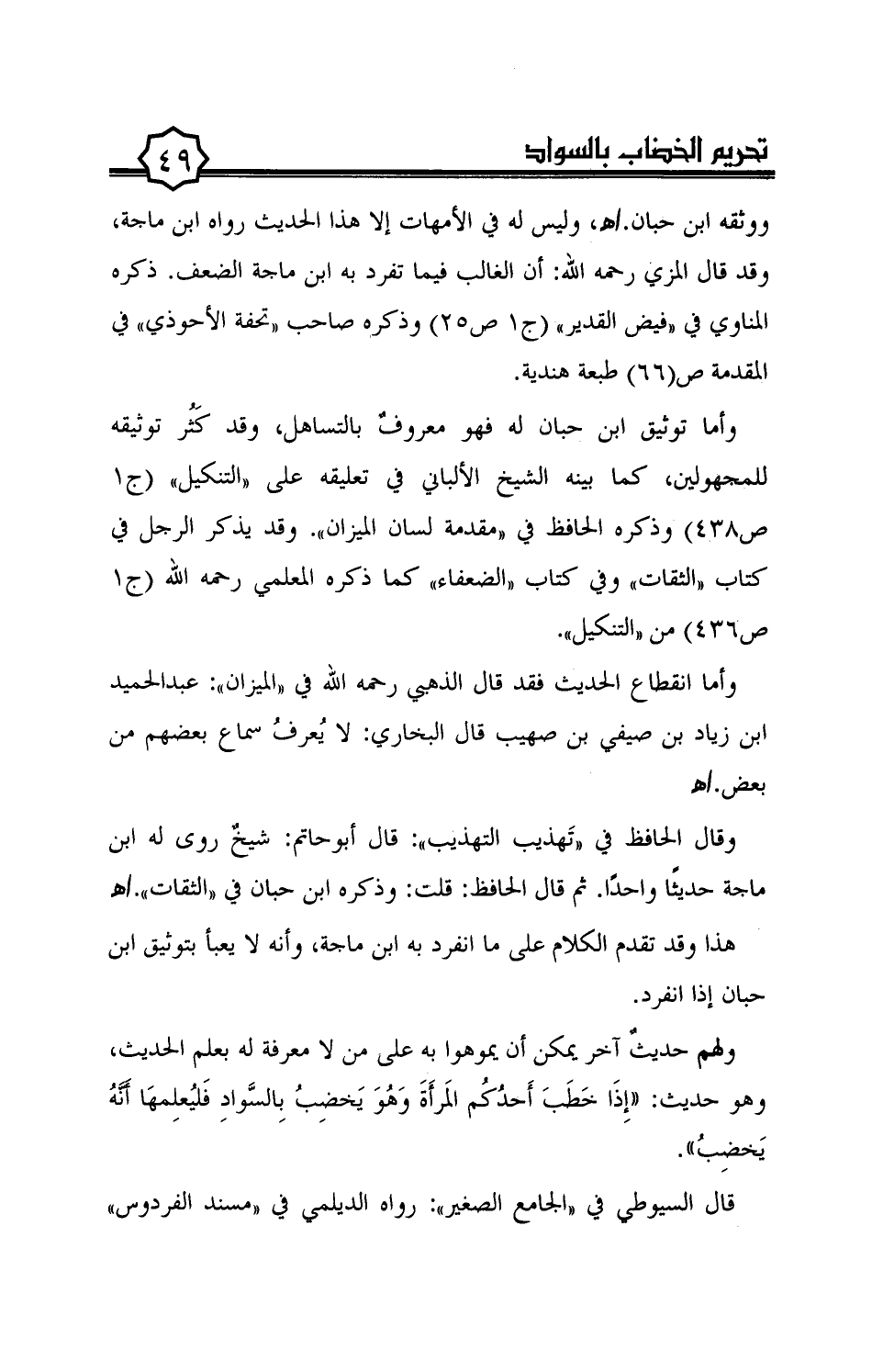 ولهم حديث آخر يمكن أن يموهوا به على من لا معرفة له بعلم الحديث، وهو حديث: ((إذا خطب أحدكم المرأة وهو يخضب بالسّواد فليعلمها أنّه يخضب)).