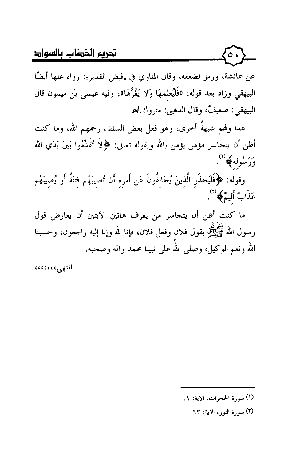 ما كنت أظن أن يتجاسر من يعرف هاتين الآيتين أن يعارض قول رسول الله صلى الله عليه وعلى آله وسلم بقول فلان وفعل فلان، فإنا لله وإنا إليه راجعون، وحسبنا الله ونعم الوكيل، وصلى الله على نبينا محمد وآله وصحبه.