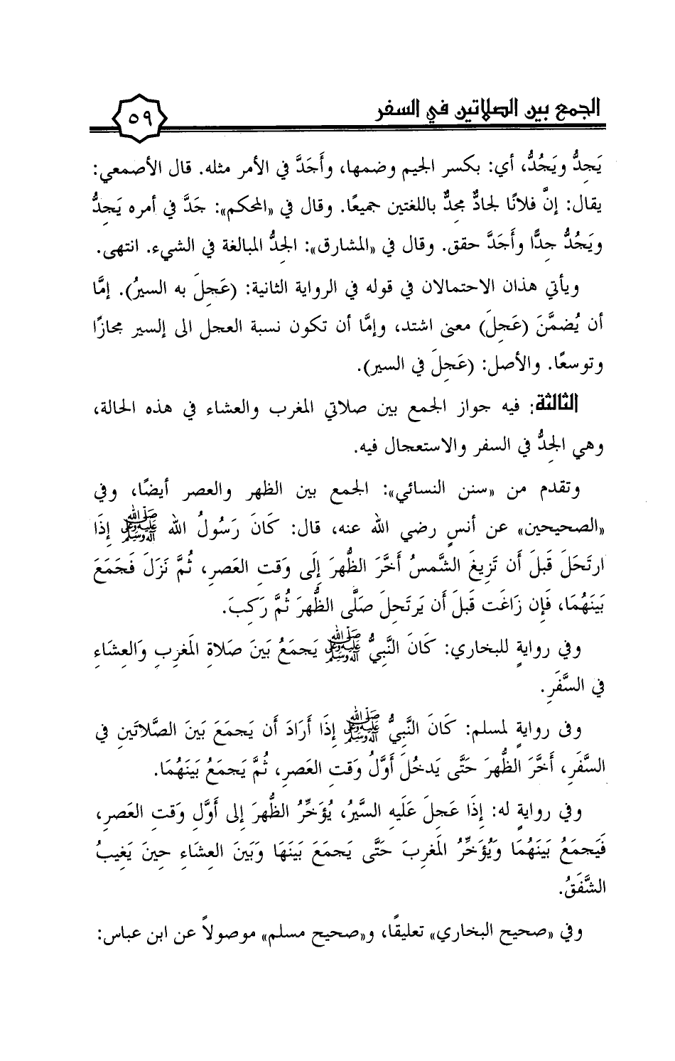 وفى رواية لمسلم: كان النّبيّ صلى الله عليه وعلى آله وسلم إذا أراد أن يجمع بين الصّلاتين في السّفر، أخّر الظّهر حتّى يدخل أوّل وقت العصر، ثمّ يجمع بينهما.